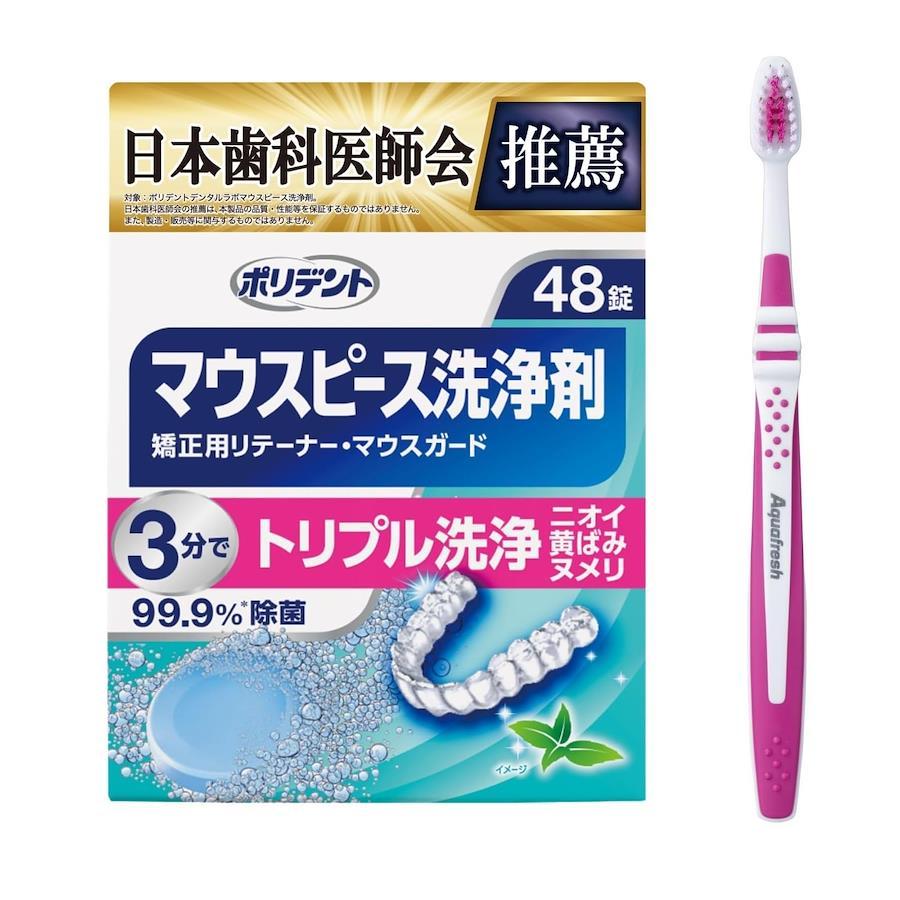 矯正用リテーナー(マウスピース型、ワイヤー型)、矯正装置(マウスピース型、取り外し式)、ナイトガード(マウスピース型)、スポーツマウスガード(マウスピース型)などに! 矯正用リテーナー・マウスピースの頑固なヨゴレ、ニオイをとり清潔に保つ洗浄剤 頑固なヨゴレを徹底洗浄、除菌。着色汚れ、ニオイ(原因菌)をとり、スッキリ、清潔に ウイルス・菌を99.9%除菌※当社調べ (in vitro) 矯正用リテーナー(マウスピース型、ワイヤー型)や矯正装置(マウスピース型)、ナイトガード、マウスガードを使用の方に ポリデントは、歯科医推奨No.1(入れ歯洗浄剤内。歯科医師サンプル(200名)に対するオンライン定量調査に基づく(2022年6月8日~18日実施)/第三者調査機関を使用しての当社調べ) おまけのハブラシは、商品の入れ替わりにより、写真と異なるものをお届けする場合があります 内容量 : 48錠x1箱 + ハブラシ1本