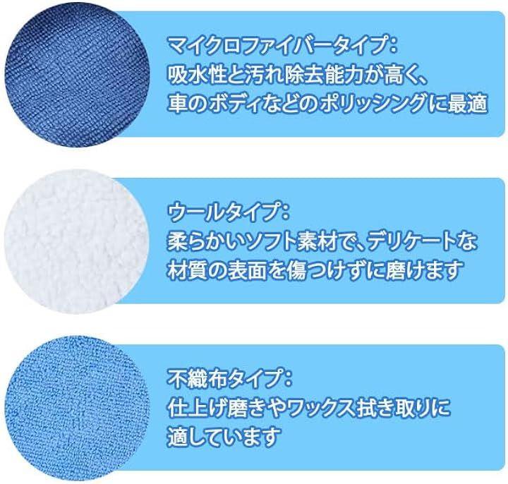 「カバーの種類と機能」 マイクロファイバータイプは、吸水性と汚れ除去能力が高く、車のボディなどのポリッシングに最適。