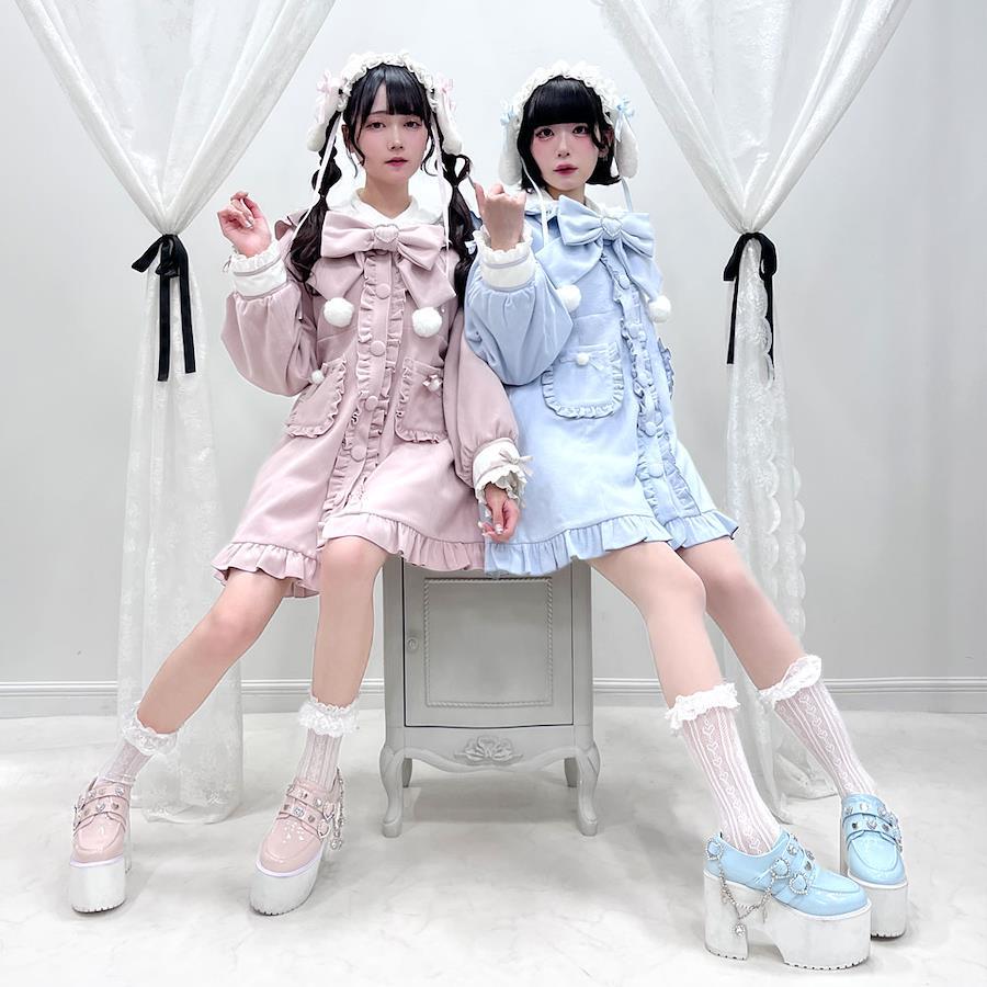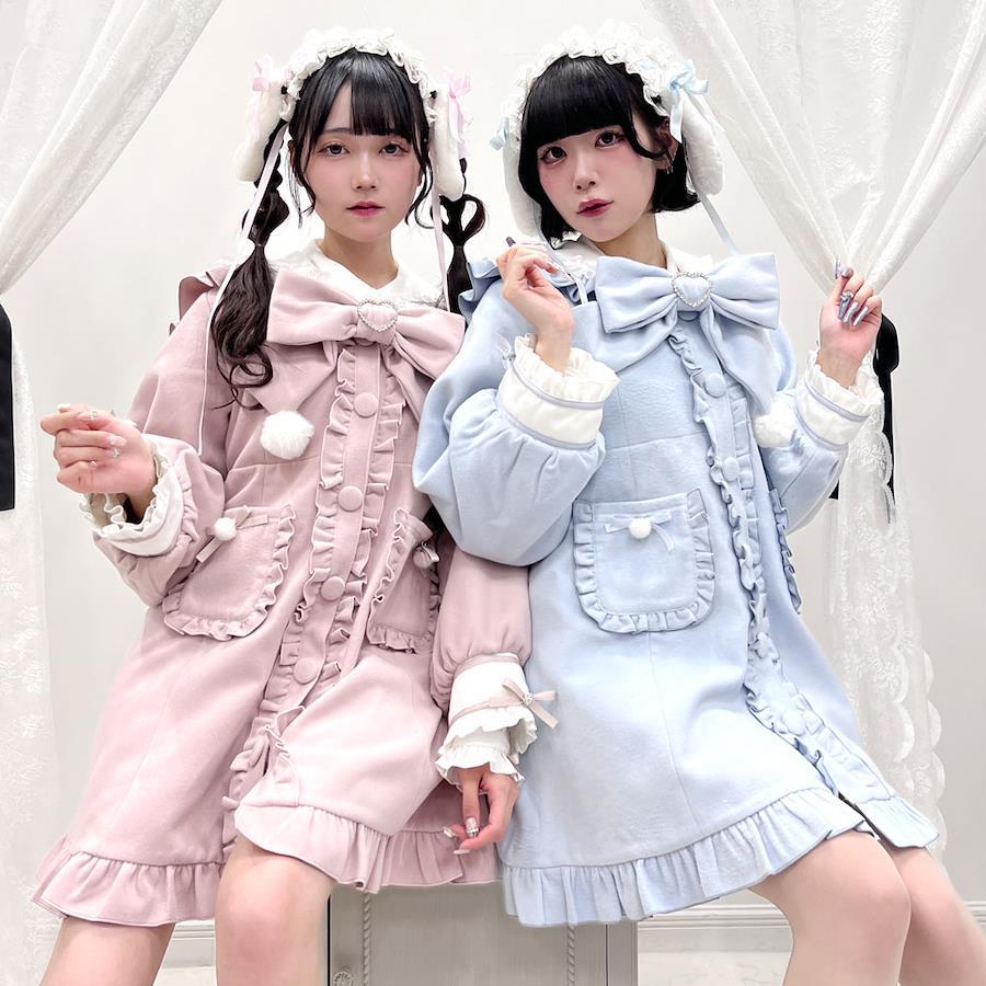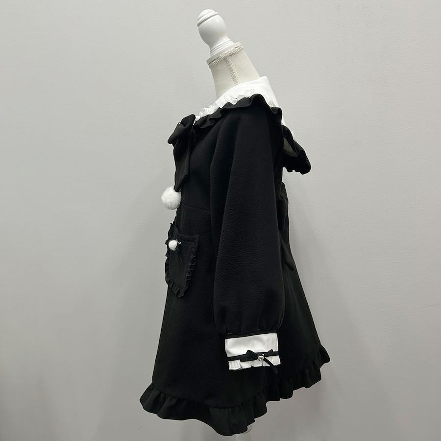 かわいすぎるセーラーフリルコートが新しくなって登場♪【デザイン】人気のセーラー襟デザインのかわいいAラインコートが新しくなって登場♪ポンポンリボンがかわいく、冬にぴったりのデザインになっています。フリルたっぷりで、襟にはレースがあしらわれていてどこを見てもかわいいデザイン。後ろには大きめリボンがついています。袖口、ポケットリボンは安全ピンで取り外し可能です。前立てのスナップボタンで着用が可能です。襟リボンは安全ピンで取り外し可能です。【素材】重みのある、ウールタッチの素材を使用しています。中綿などは入っていないので、着ぶくれしにくい素材感です。《透け感》なし 《生地の厚さ》普通 《裏地》あり 《伸縮性》なし《生産国》中国