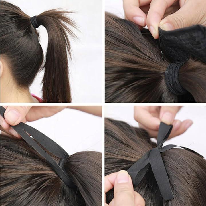 「使用方法」自毛をヘアゴムで結び、コームをヘアゴムに引っ掛けるように差し込んだら、リボンを引っ張り結んで完成