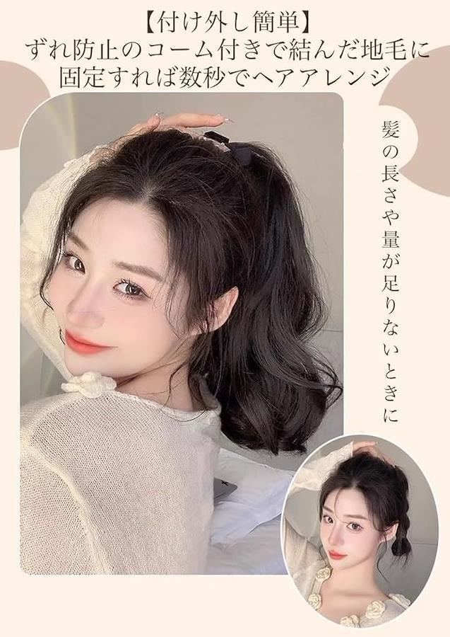 「付け外し簡単」ずれ防止のコーム付きで結んだ地毛に固定すれば数秒でヘアアレンジ・地毛と馴染みやすく髪の長さやボリュームが足りないときに最適・とても柔らかく、お手入れも簡単