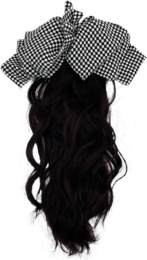 Ponytail Wig, Ribbon, Bowknot, Clip Type, Curl, Curly Hair, Natural Extensions, False Hair, Plaid Pattern x Dark Brown