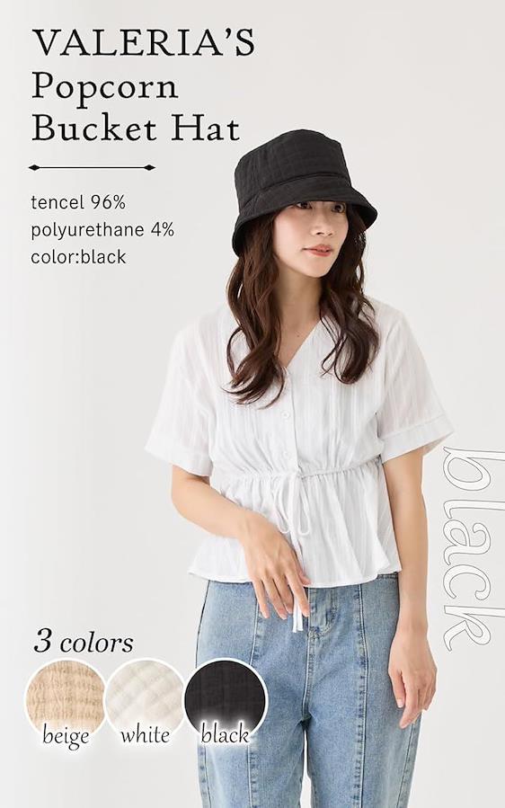 チェック柄のような風合いのポップコーン生地を使用した、トレンドのバケットハット。