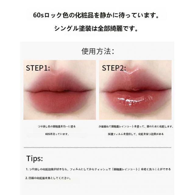 【2in1リップグロス+マットリップ】グロスとマットリップが一つになった画期的な2WAYデザイン。面倒な筆や指を使わず、一本で立体感のある大人かわいいグラデーションリップがすぐに仕上がります。メイク初心者でもプロのような仕上がり。完璧な唇メイクを実現。もっちりした水光りのある唇を演出し、重ね塗りできるウォーターグロスリップグロス、色落ちなし。