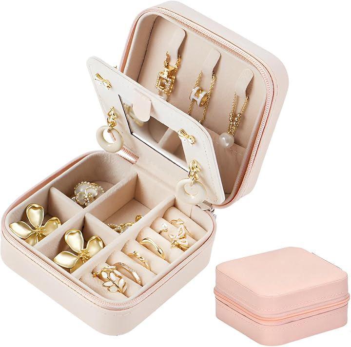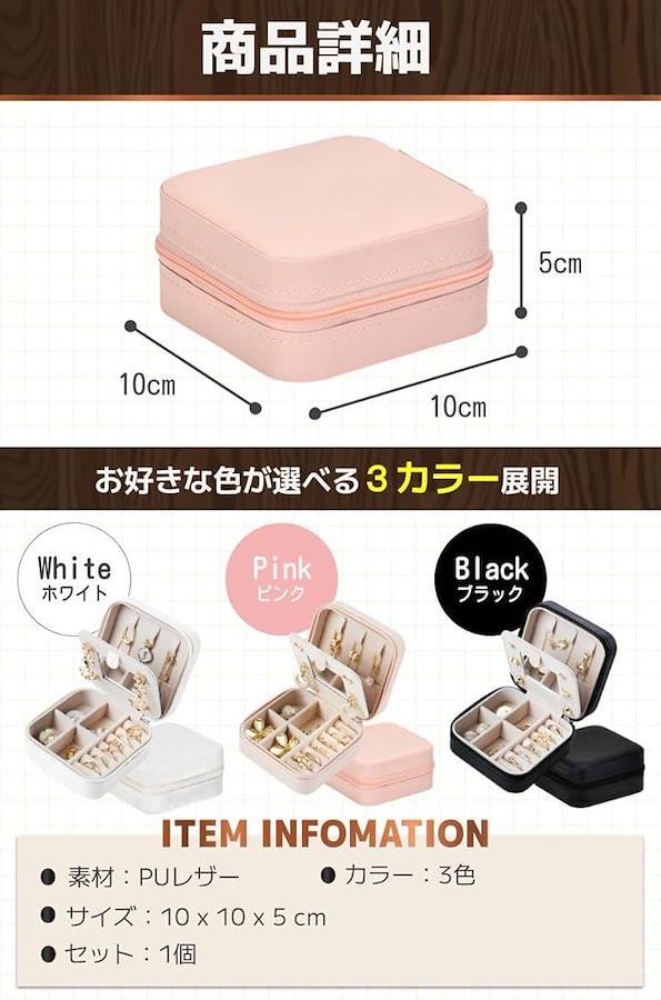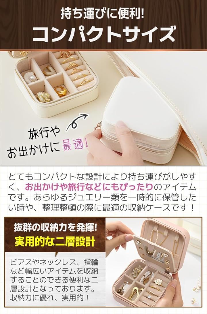 「商品特徴」(1)高品質PUレザー製:重厚感たっぷりのPUレザーで高級感を演出/(2)便利なミラー付き:ジュエリーの装着やメイク直しに。/(3)ファスナータイプ:中のジュエリーが滑り落ちる心配なし。/(4)仕切りは取り外しOK:収納方法に合わせて柔軟に対応。