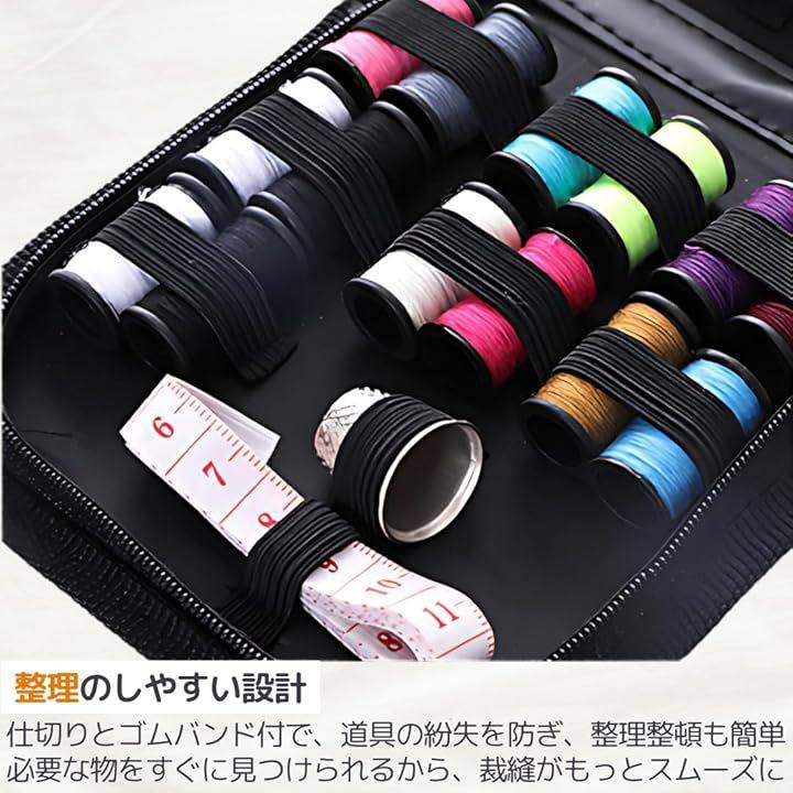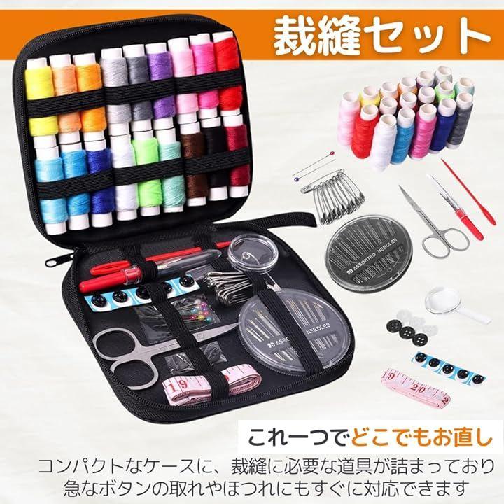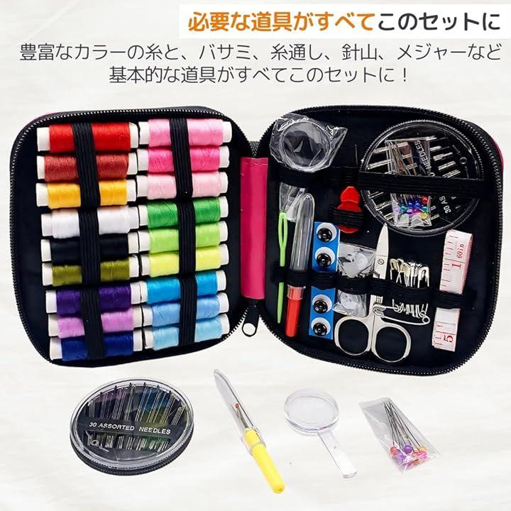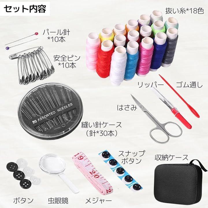 「必要な道具がすべてこのセットに」18色の豊富な糸に加え、針、まち針、はさみ、メジャー、ボタン、リッパー、糸通し、ひも通しまで、基本の裁縫道具がすべて揃っています。