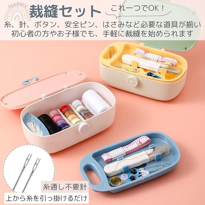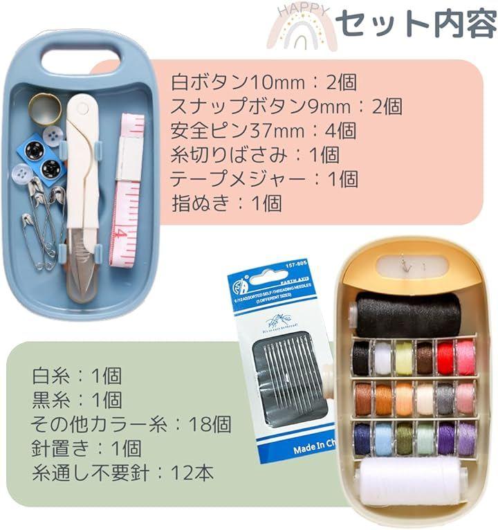 「セット内容」白ボタン10mm:2個 / スナップボタン9mm:2個 / 安全ピン37mm:4個 / 糸切りばさみ:1個 / テープメジャー:1個 / 指ぬき:1個 / 白糸、黒糸:各1個 / その他カラー糸:18個 / 針置き:1個 / 糸通し不要針:12本 「カラー」ホワイト / ピンク