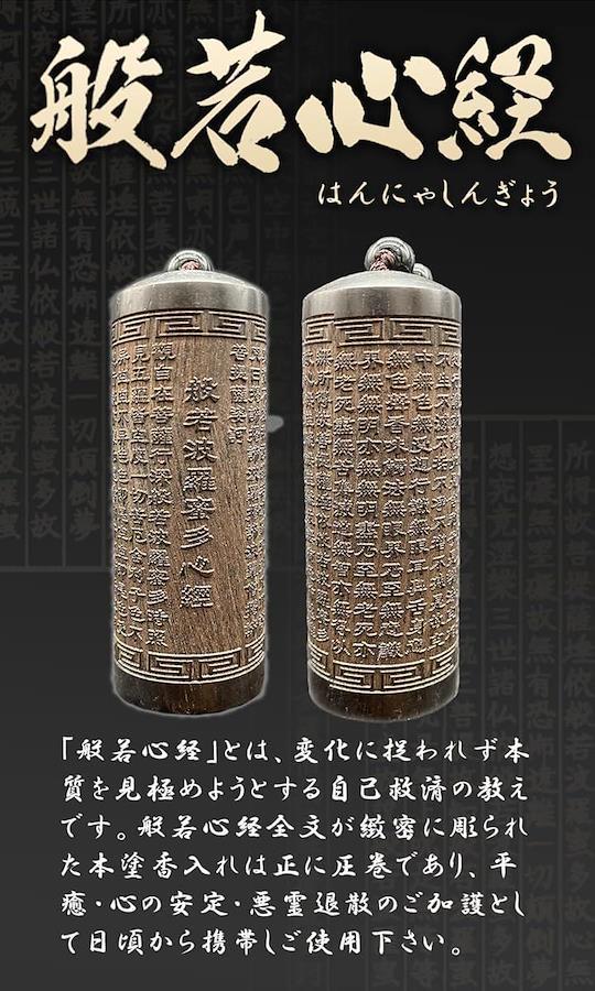 般若心経全文が緻密に彫られた本塗香入れは正に圧巻であり、平癒・心の安定・悪霊退散のご加護として日頃から携帯しご使用下さい。