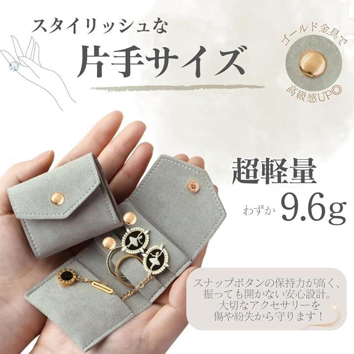 「小さく軽量で携帯に便利」 重さ約9.6g、折りたたむと縦52x横60mmと手のひらサイズで、バッグやポケットにすっきり収まるジュエリーポーチです。