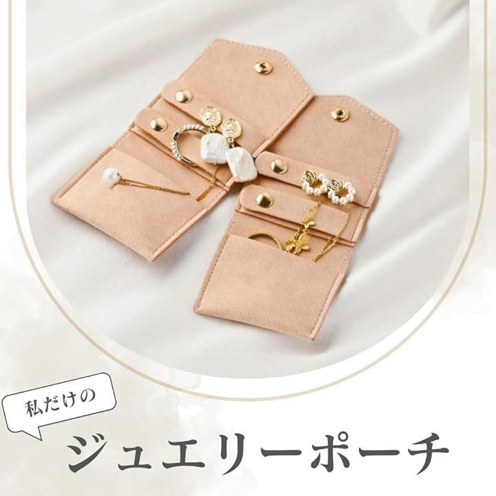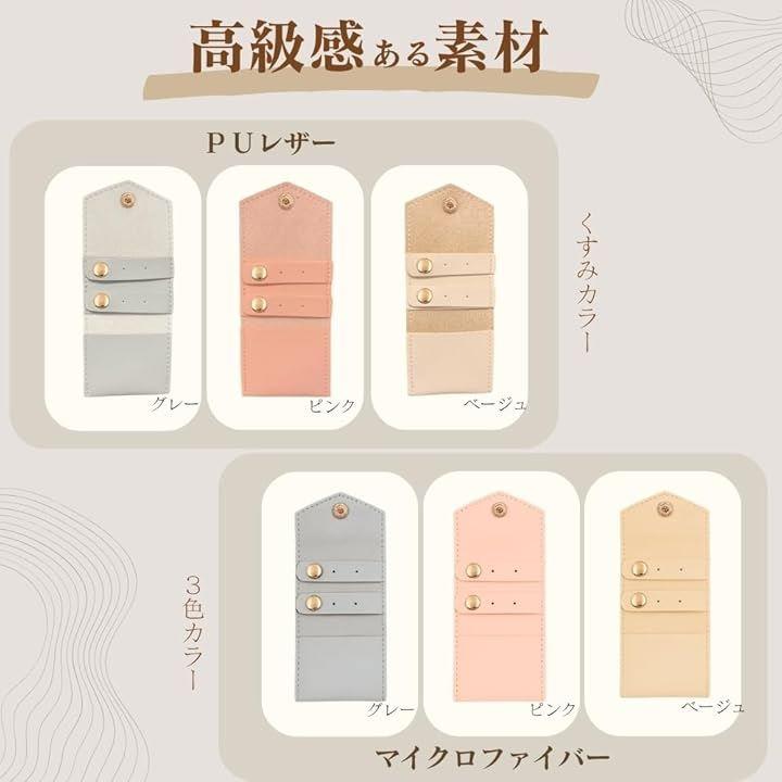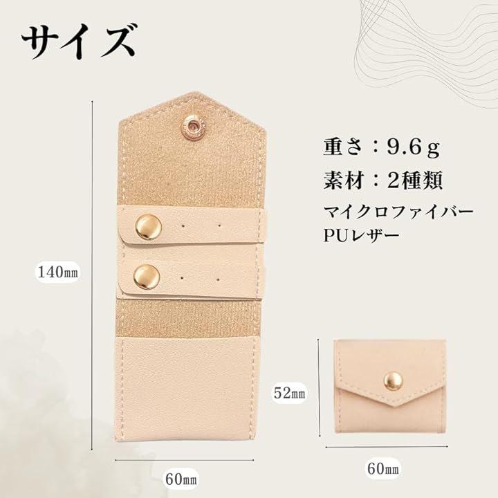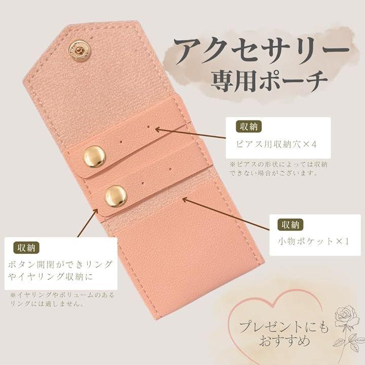 「ピアス・指輪に特化した収納設計」 ボタン開閉できるピアス用収納穴x4と小物ポケットx1付きで、リングやイヤリングをしっかり整理でき、出先でも安心です。