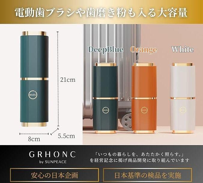 「カラー」ホワイト/オレンジ/ディープブルー「サイズ」高さ21x幅8x奥行5.5cm/約120g「素材」ABS+PP 「機能」分離式コップ / 電動歯ブラシ収納可能 / 大容量収納 / 軽量 / 防水 / 防塵 「利用シーン」旅行、出張、キャンプ、ジム、オフィスなど