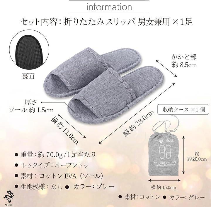 「商品仕様」セット内容:折りたたみ 携帯スリッパx2足 男女兼用 サイズ(スリッパ本体): 縦 約28.0cm 横 約11.0cm (かかと部 約8.5cm) 厚さ ソール 約1.5cm 甲バンド 約4.0mm 重量:約70.0g/1足当たり トゥタイプ:オープントゥ 素材:コットン EVA(ソール) 生地模様:なし カラー:ブラック、グレー 収納ケースx2個 サイズ:縦 約20.0cm 横 約15.0cm 素材:コットン カラー:ブラック、グレー *モニターの環境等により、色の見え方に若干差が生じる場合がございます。