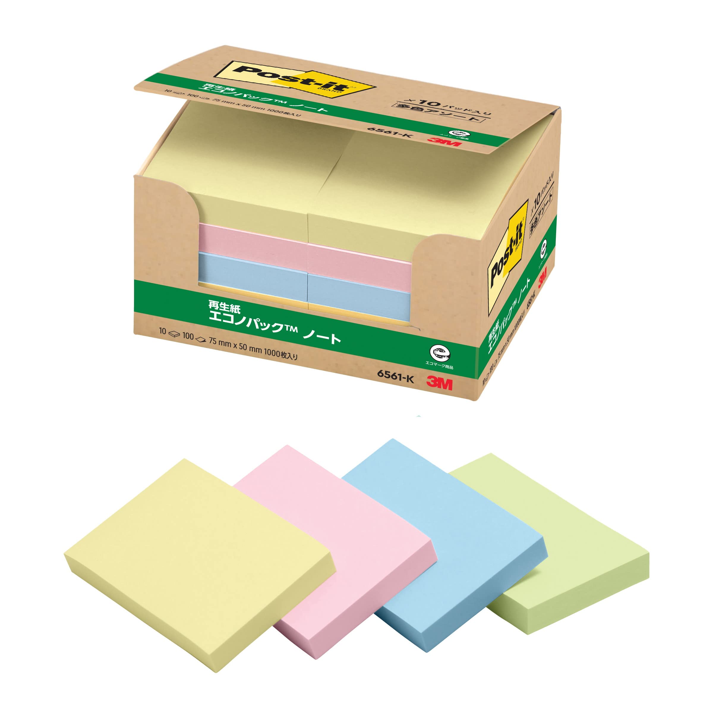 ●ふせんサイズ:75x50mm。 名刺よりひとまわり小さいサイズのポストイット付箋です。情報の分類・整理、ちょっとした伝言に便利なサイズです。●くり返し貼ったりはがしたりでき、相手をいためません。●100枚x10パッド。●たっぷり入ってお買い得。オフィスでの買い置きにおすすめです。●色分けにも便利な混色タイプ。●リサイクル:古紙パルプ配合率100%の再生紙を使用。●エコマーク取得。●グリーンマーク取得。グリーン購入法適合。●GPNエコ商品ねっと掲載。●中身が見やすく取り出しやすい、収納に便利な紙箱入り。