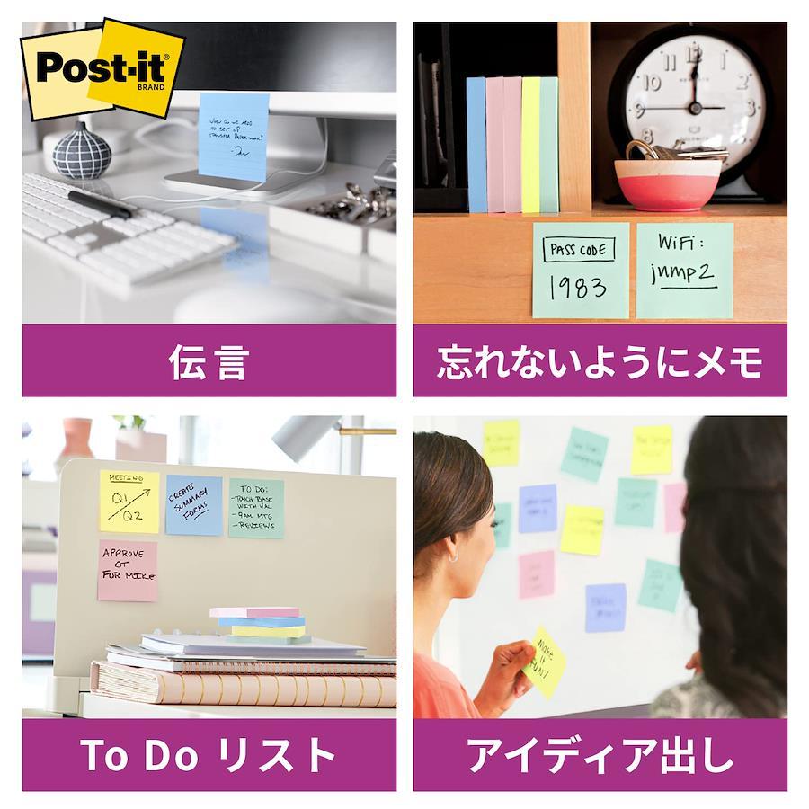 ●ふせんサイズ:75x50mm。 名刺よりひとまわり小さいサイズのポストイット付箋です。情報の分類・整理、ちょっとした伝言に便利なサイズです。●約2倍*の強粘着タイプで、クリアファイルやパソコン、電話などの樹脂面や、キャビネットや家具などのスチール面、扉、壁などの垂直面、ダンボールなど、つきにくかった場所にもしっかり貼れるので、大切な伝言やメモに最適です。しっかり貼れてきれいにはがれるのが特長の製品です。(*当社通常粘着比)●90枚x5パッド。●色分けにも便利な混色タイプ。●色:イエロー、ピンク、ネプチューンブルー、アップルグリーン●リサイクル:古紙パルプ配合率100%の再生紙を使用。●エコマーク取得。●グリーンマーク取得。グリーン購入法適合。●GPNエコ商品ねっと掲載。●中身が見やすく取り出しやすい、収納にも便利な紙製スリーブケース入り。