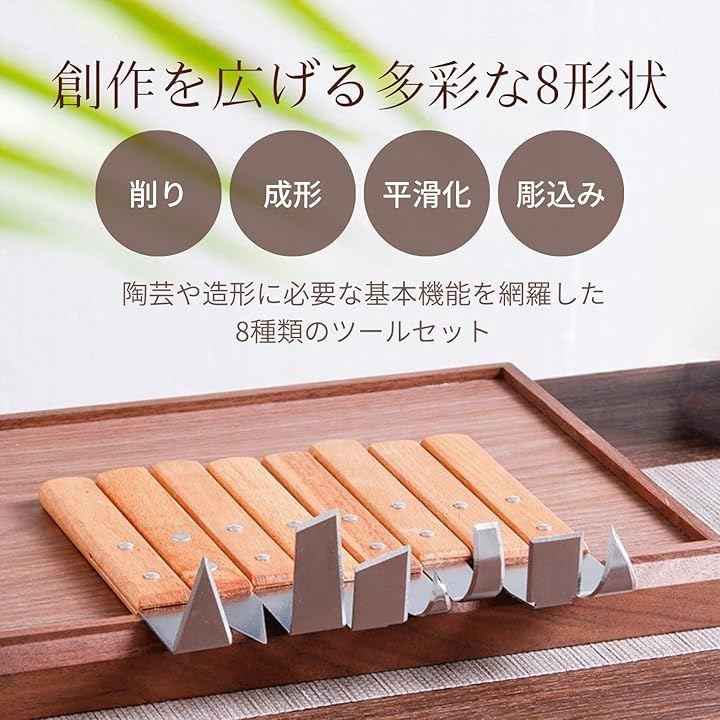 「創作を広げる多彩な8形状」 削り、成形、平滑化、彫り込みなど、陶芸や造形に必要な基本機能を網羅した8種類のツールセットです。