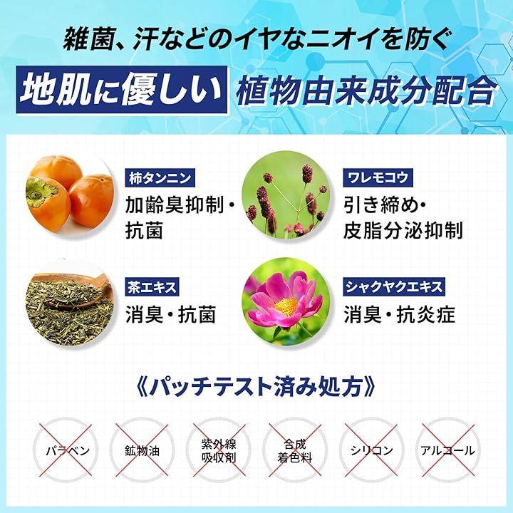 柿タンニン(加齢臭抑制・抗菌)、ワレモコウ(引き締め・皮脂分泌抑制)、茶エキス(消臭・抗)、シャクヤクエキス(消臭・抗炎症)。