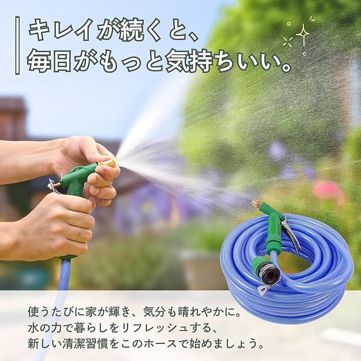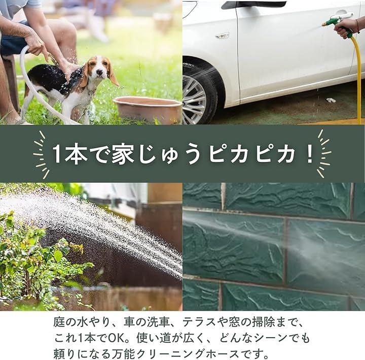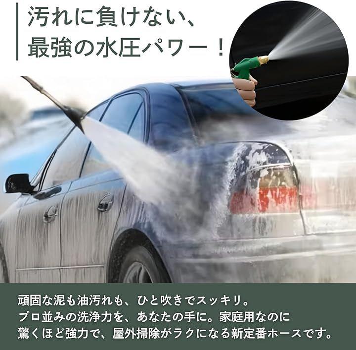 「洗浄力」 強力な水圧を誇るこのホースなら、泥汚れや頑固なシミもあっという間にキレイ。調整可能なノズルで水の勢いを自由に変えられるため、車の洗浄から壁・床の掃除まで、幅広く活躍します。