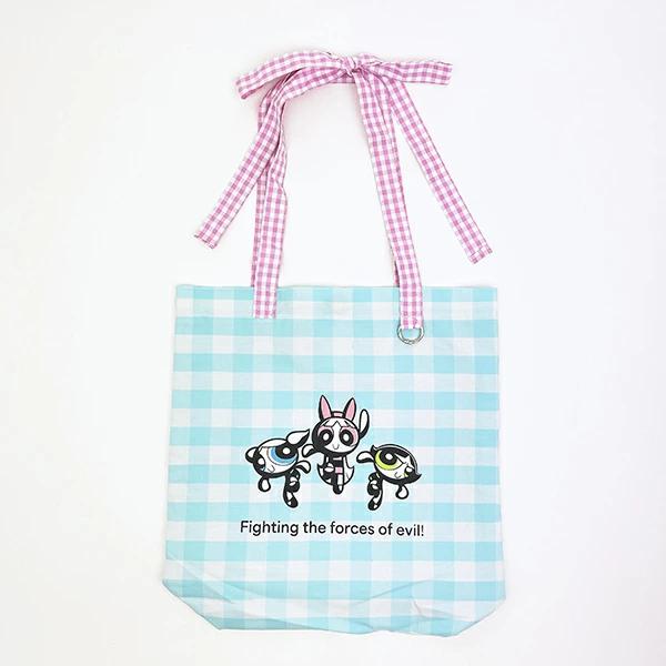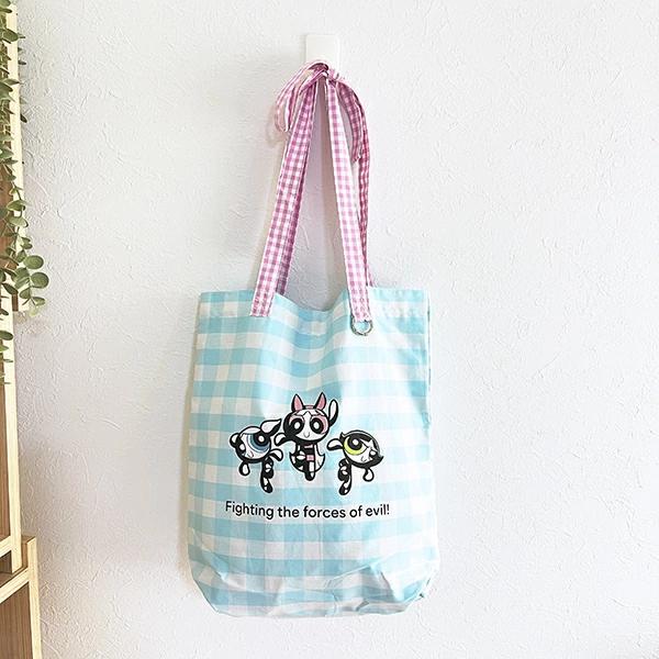 リボンの持ち手がキュートなパワーパフガールズのギンガムチェックトートバッグです。A4サイズが入るので普段使いとしても◎書類などを入れるサブバッグとしてもgoodです☆チャームなどをつけられる金具もあって推し活用にもぴったり♪持ち手がリボンになっているので、コーディネートのアクセントにもなる最強バッグ♪同シリーズのポーチとセットで持つと可愛さMAXです☆彡