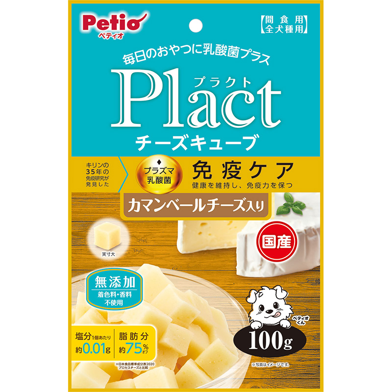 Plactはペットの健康を考えて乳酸菌をプラスしたブランドです。塩分1個当たり約0.01gで脂肪分約75%オフ(日本食品標準表2020「プロセスチーズ」と比較)だから、毎日のおやつや体重が気になる愛犬におすすめ!カマンベールの風味広がるひとくちサイズのチーズ。穀物不使用のグレインフリー。着色料・香料無添加。