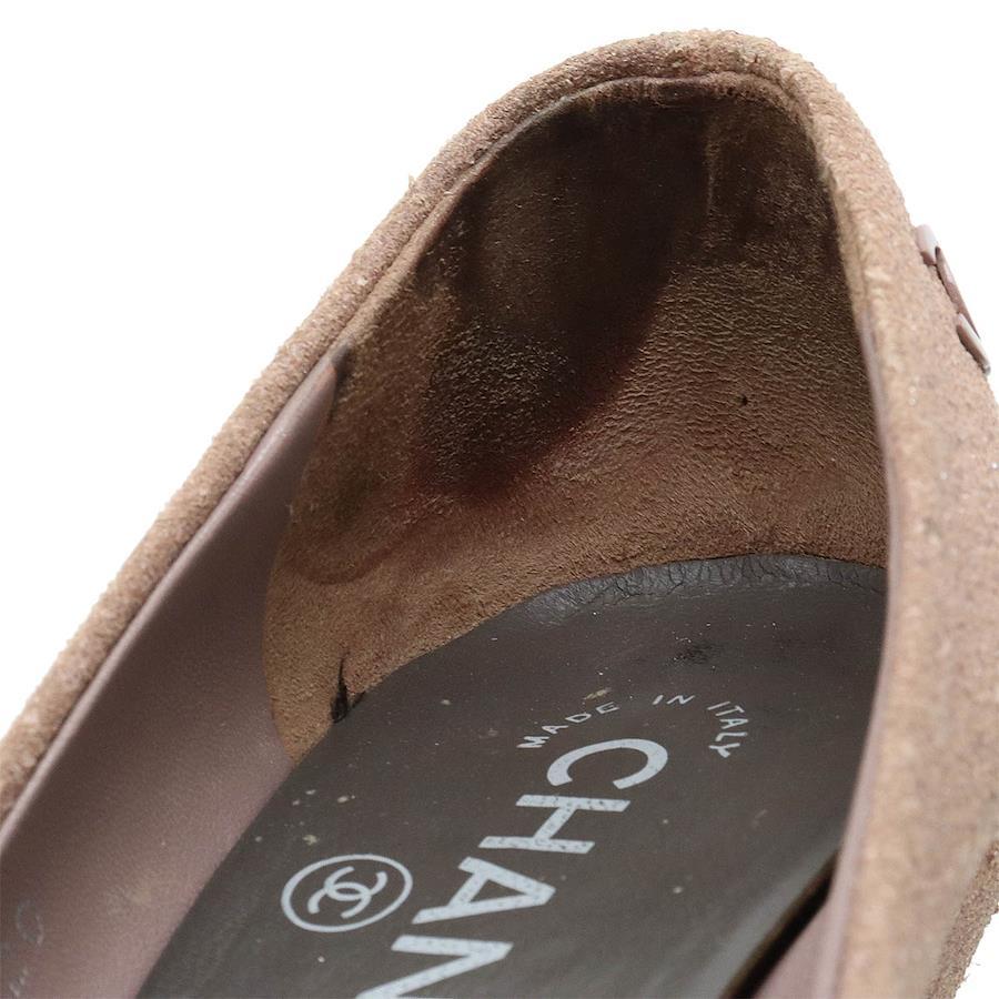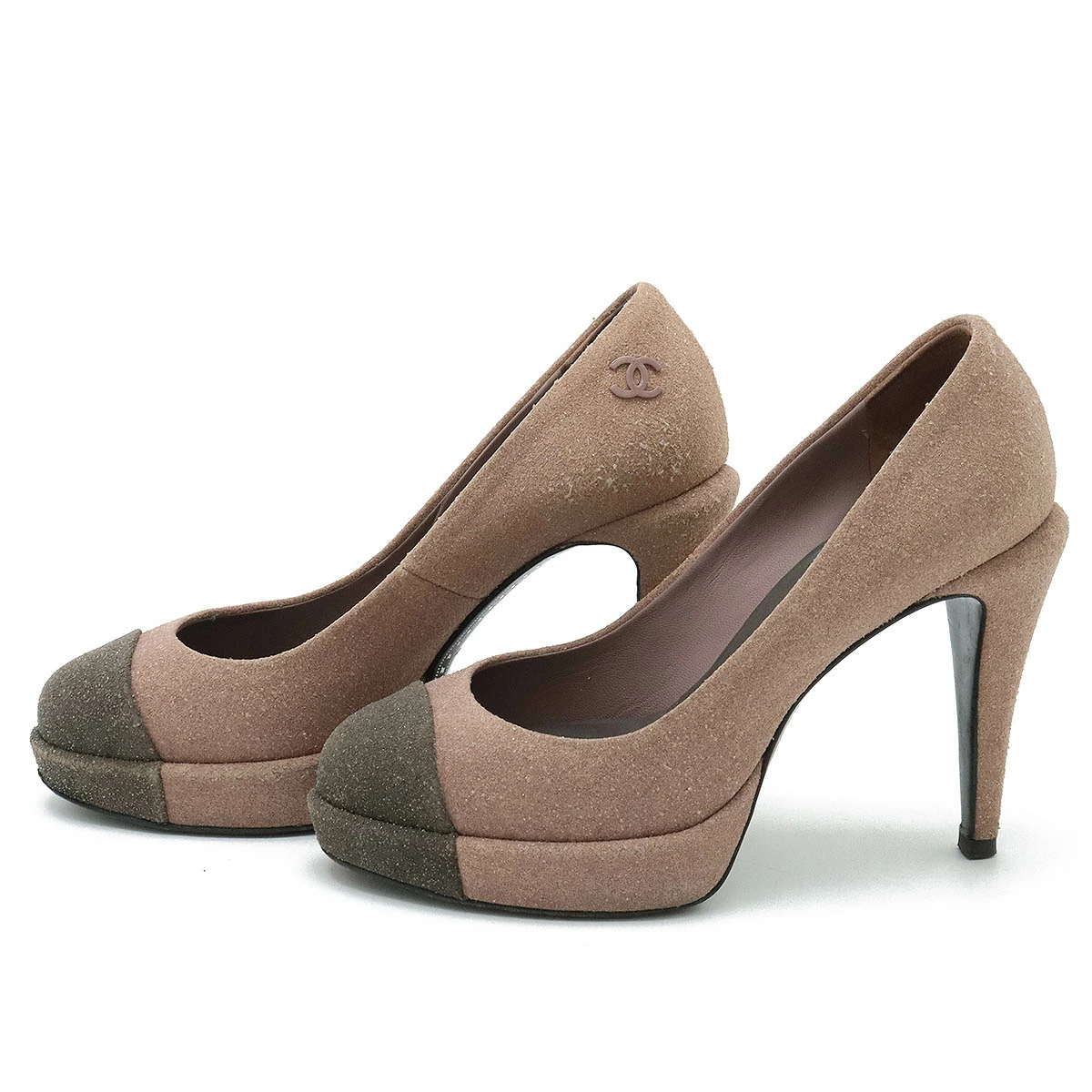 アイコンパーツとざらっとした素材が可愛らしいシャネルのバイカラーパンプス。