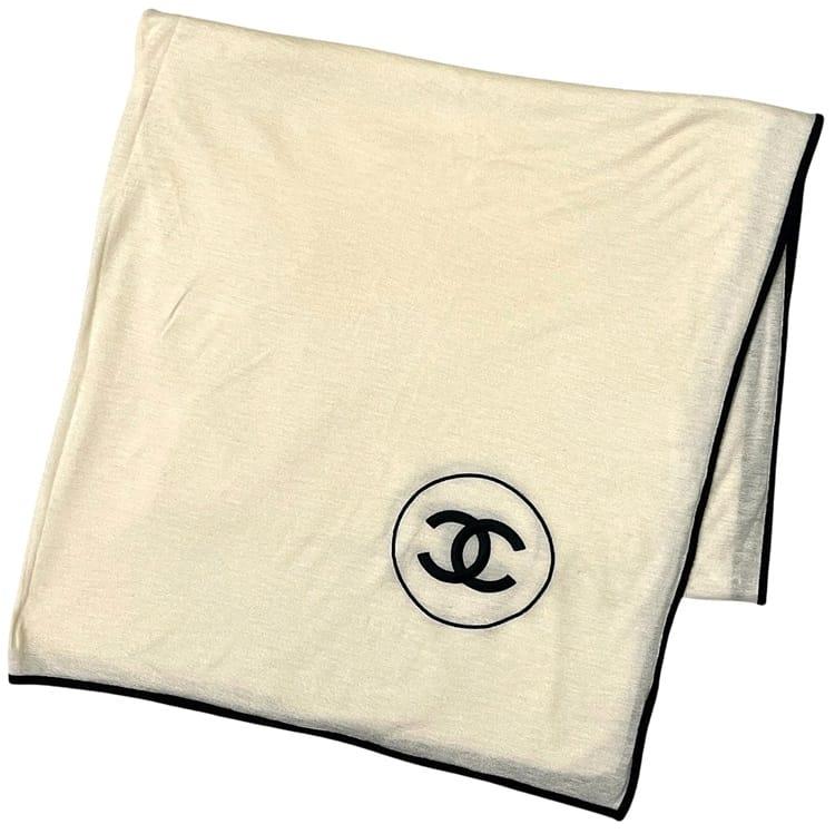 ☆---- 商品について ----☆シャネル ストール ec-24590 アイボリー ブラック ココマーク クリーニング済み カシミア 70% シルク 30% 中古 シャネル アパレル白 ロゴ ロング ショール ひざ掛け レディース 女性 定番 人気 薄手 シンプル ワンポイント ココ ブランド 本物 鑑定済み