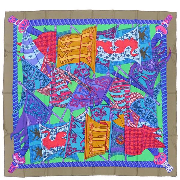 【【 エルメス HERMES スカーフ カレ90 CARRE カレ シルク パープル×グリーン×レッド【Etendards et Bonnieres/旗】 - レディース定番 人気 美品 【中古】】 【エルメス HERMES】【-】