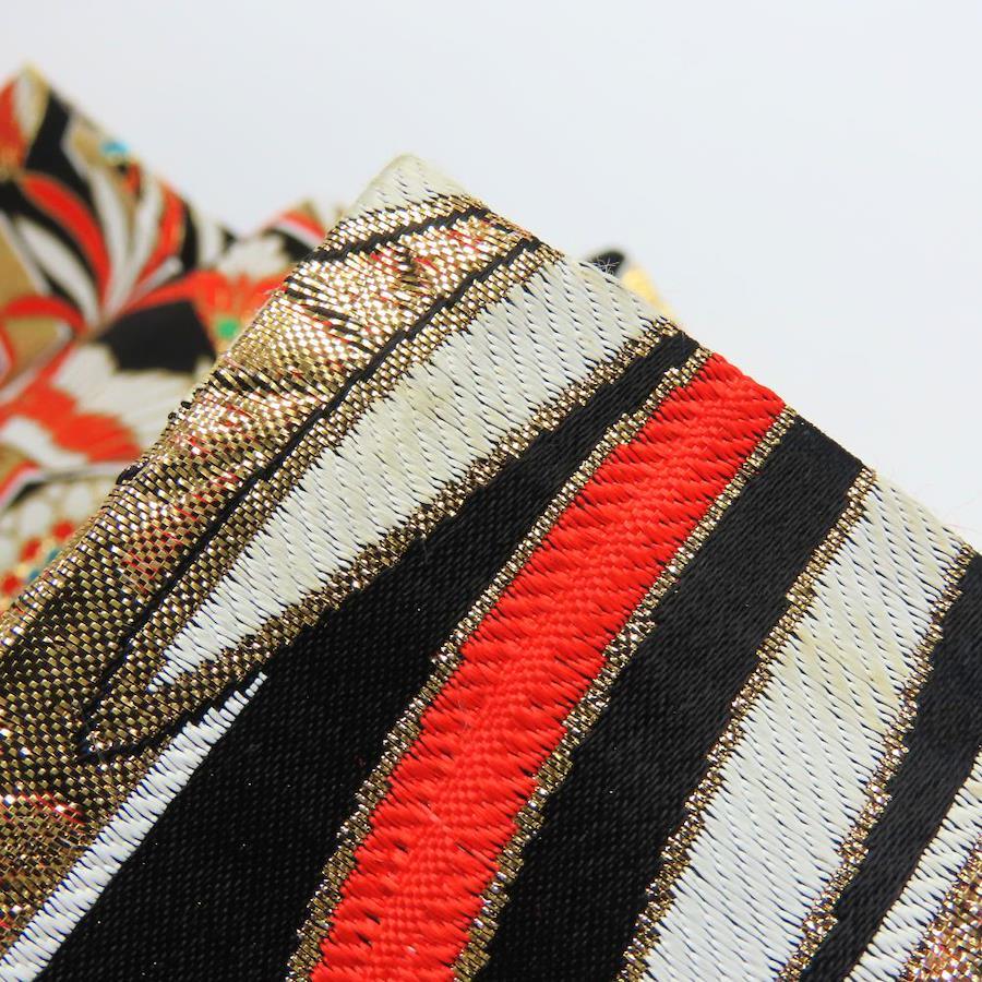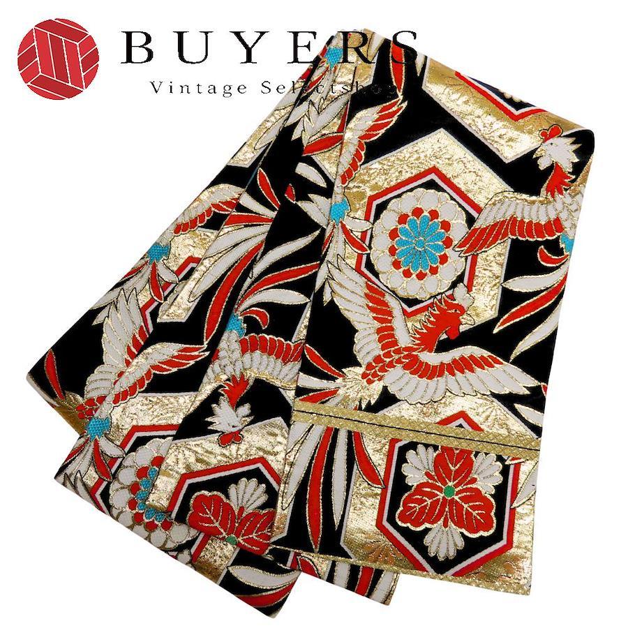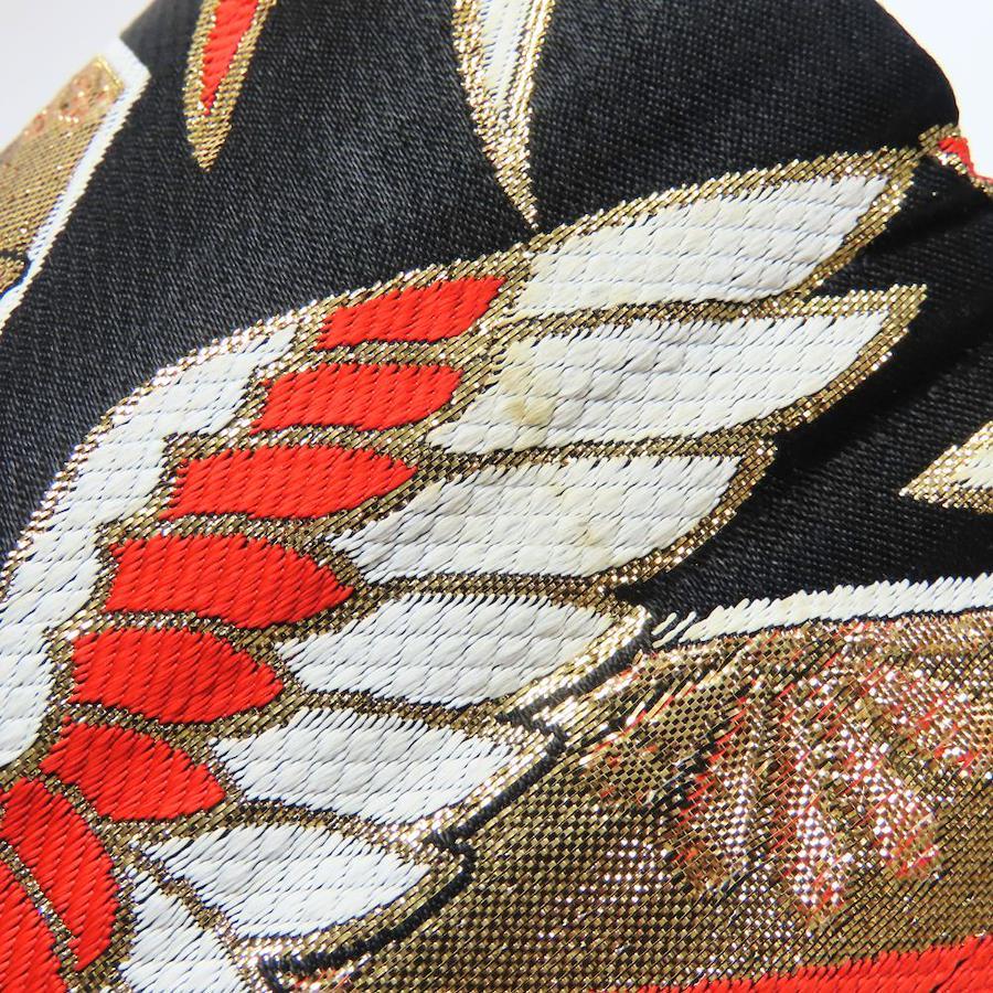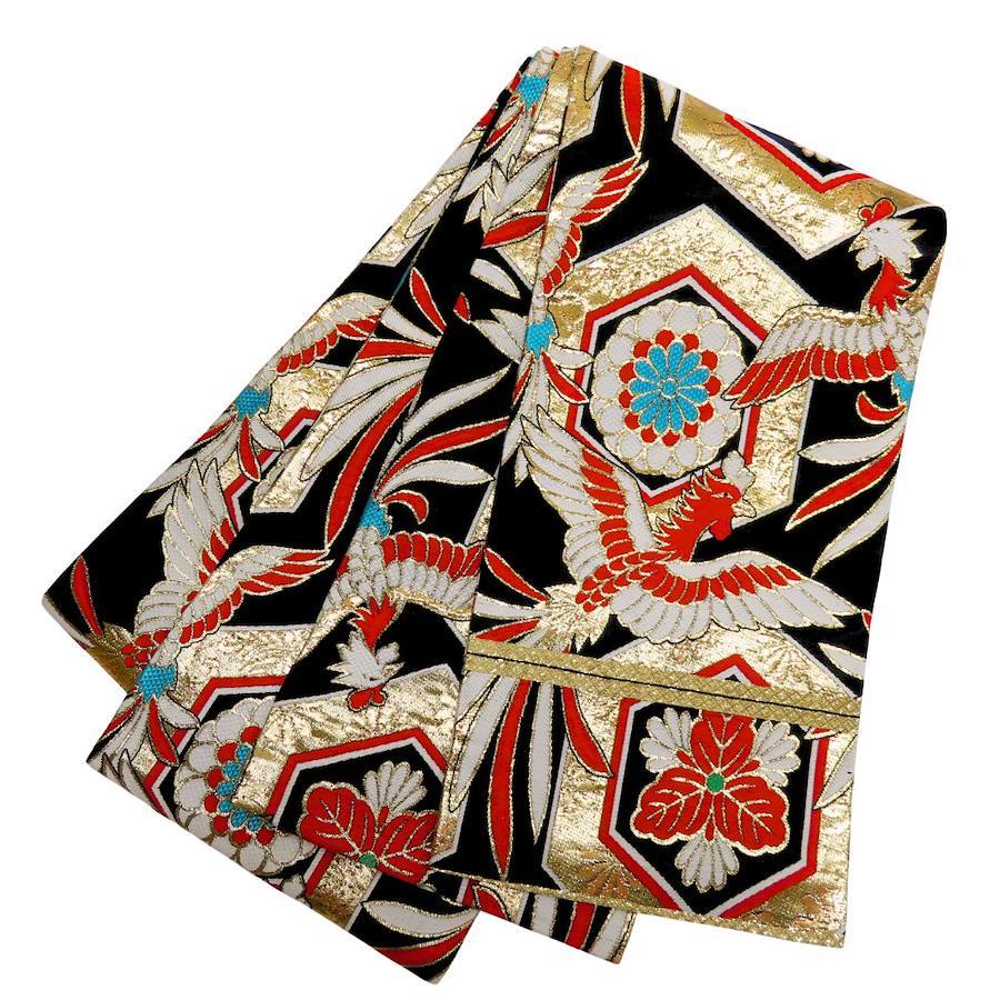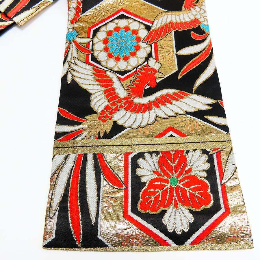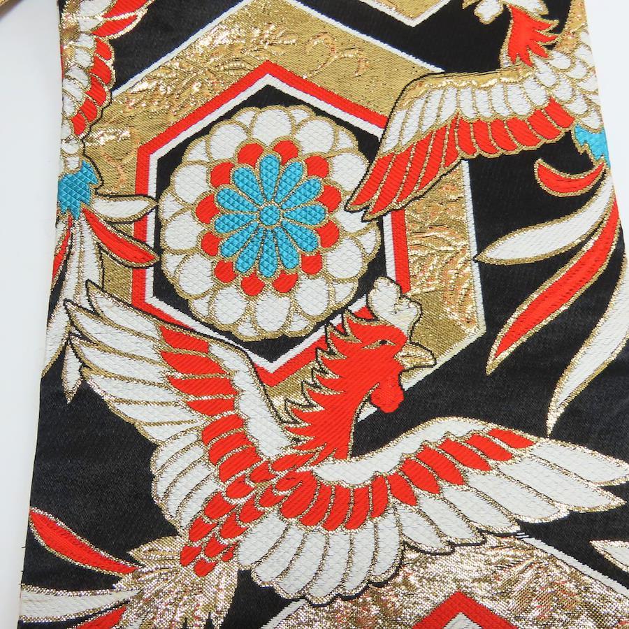 | 品名 | 【中古】 袋帯 キッズ 七五三 ポリエステル ブラック ゴールド マルチカラー 女の子 亀甲 鳳凰 |