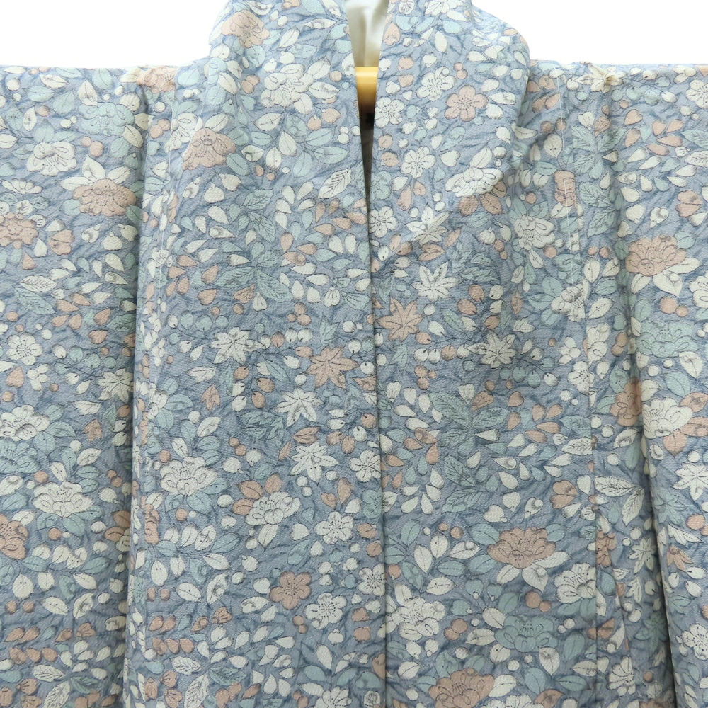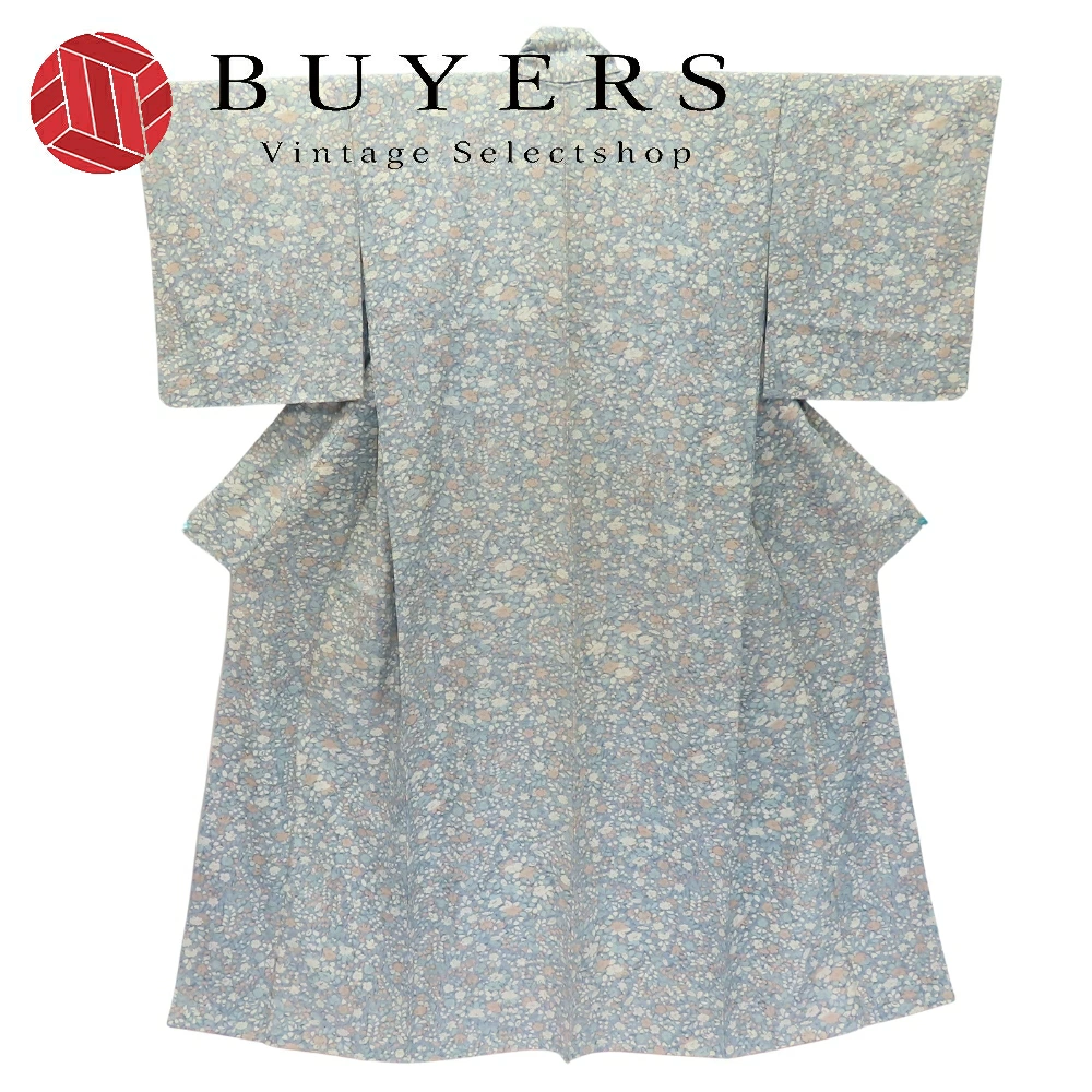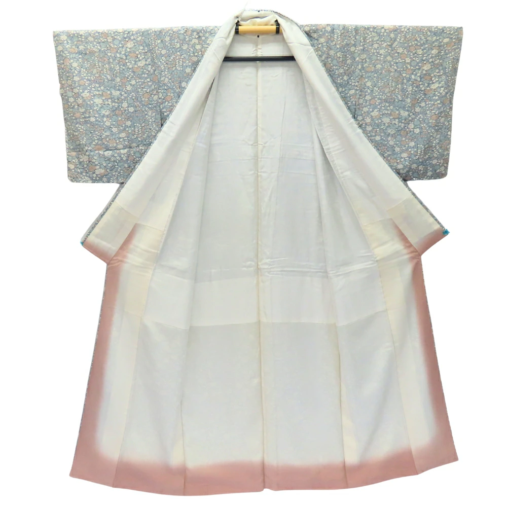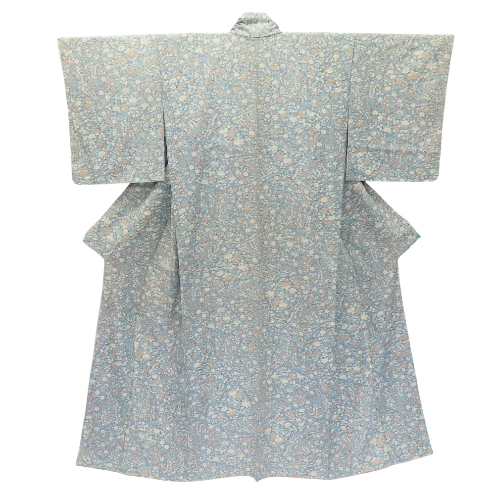 品名【中古】 小紋 高級ちりめん しつけ糸あり 正絹 グレー系 くすみブルー くすみピンク ホワイト 但馬縮緬 草花柄 レディース 女性