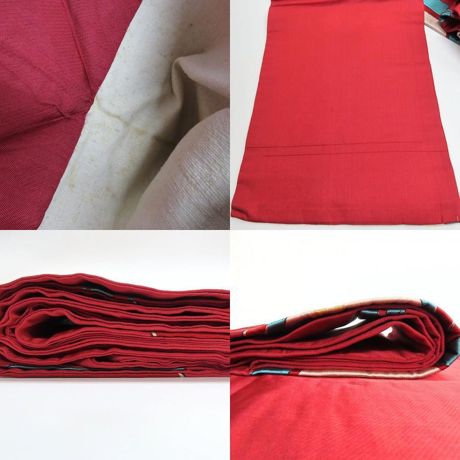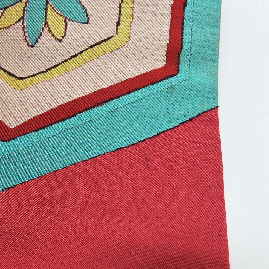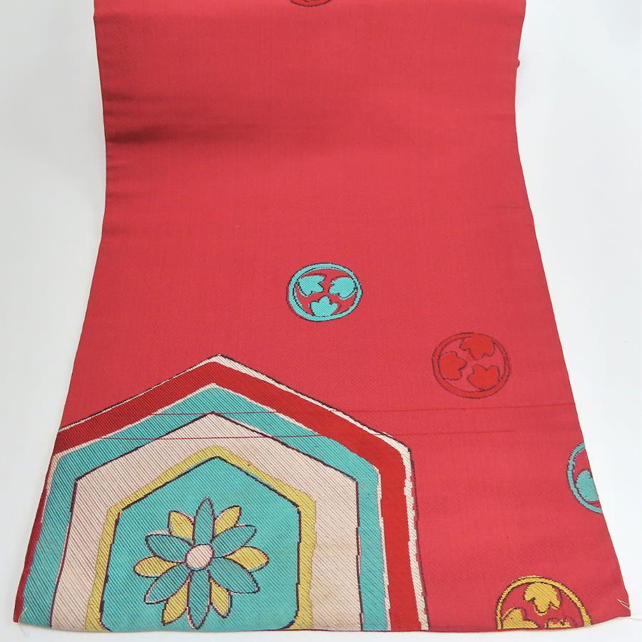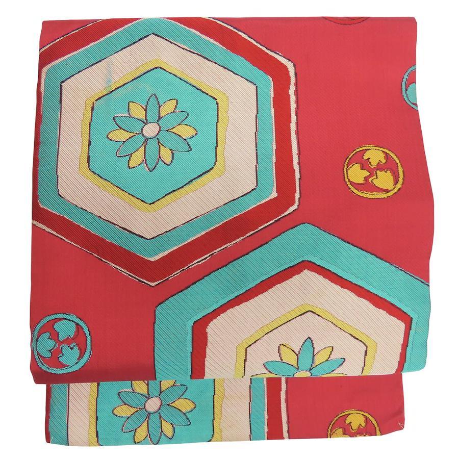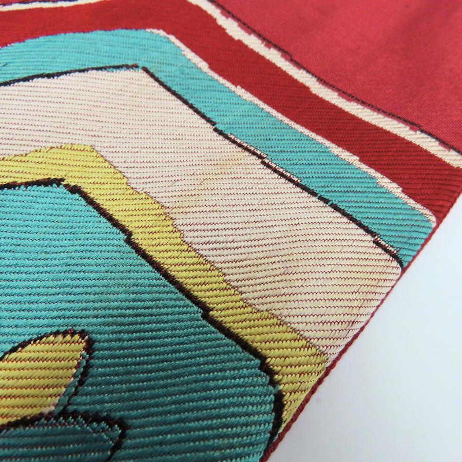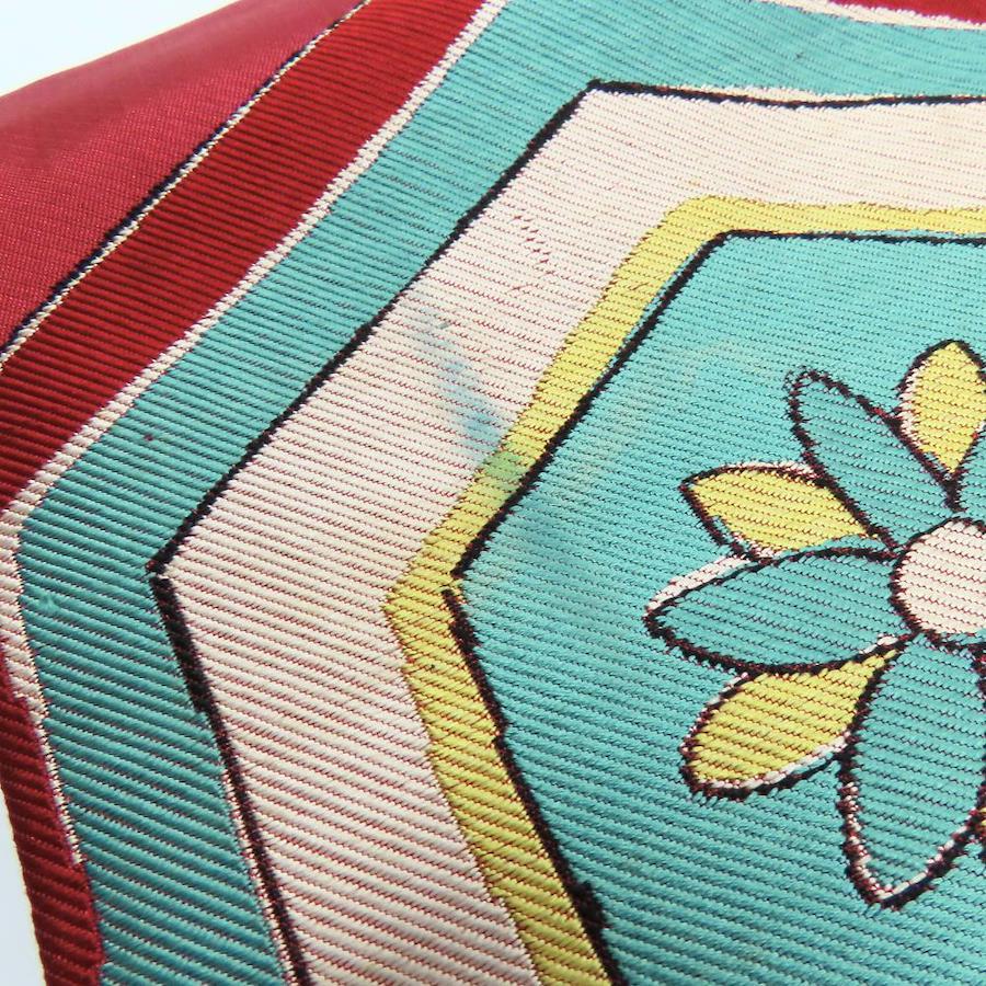品名【中古】 名古屋帯 九寸 正絹(金銀糸除く) ワインレッド系 ライトブルー イエロー ホワイト 名古屋仕立て お洒落 レディース 女性