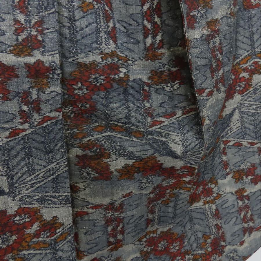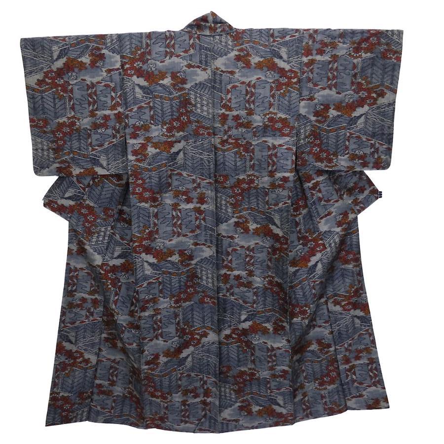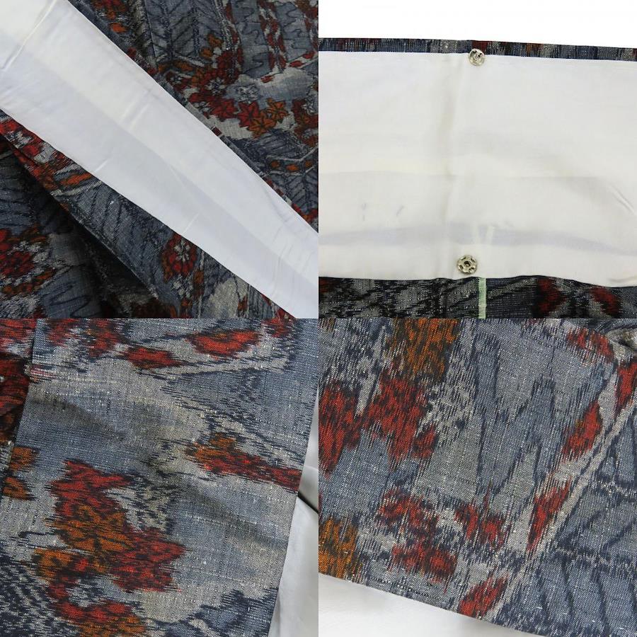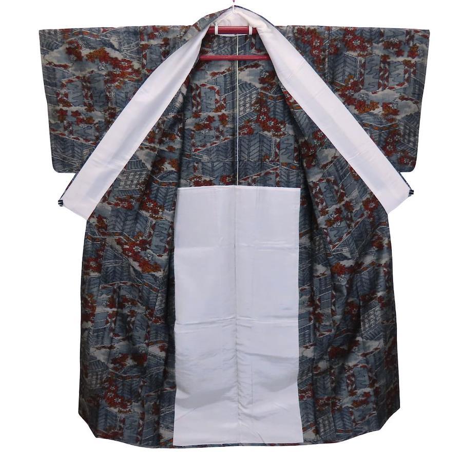 | 品名 | 【中古】 紬 正絹 ブルーグレー オレンジ レッド 単衣 竜田川模様 レディース 女性 |