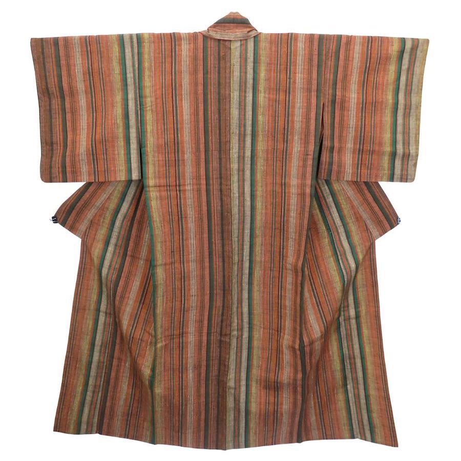 Pre-owned Tsumugi Silk Kimono in Brown, Orange, and Multicolor. Stylish, Single-Layer Kimono for Women.