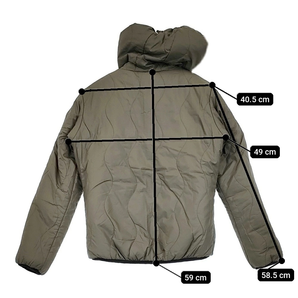 | 品質表示 | 表地:ポリエステル100% 裏地:ナイロン100% 中綿:ポリエステル100% 袋布:ポリエステル65%、レーヨン35% |