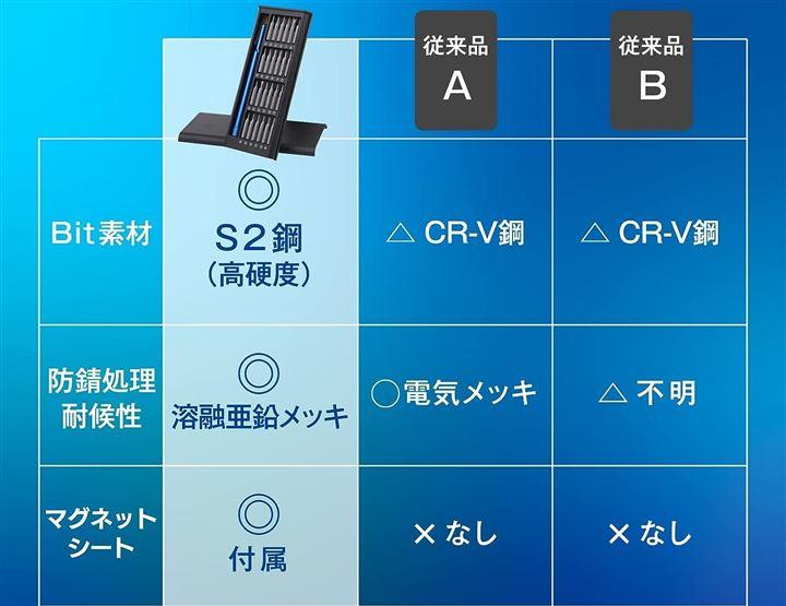 「高硬度S2鋼」精密ドライバーに使われているS2鋼は特殊な熱処理とクロムメッキ処理を施すことで、硬度と靭性を強化し、従来のCR-V鋼に比べて大幅に耐久性がアップしました。