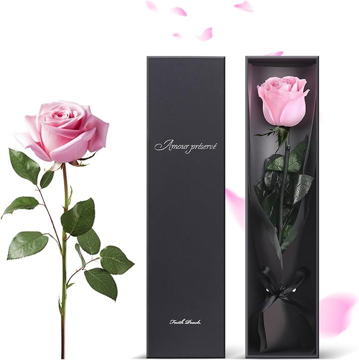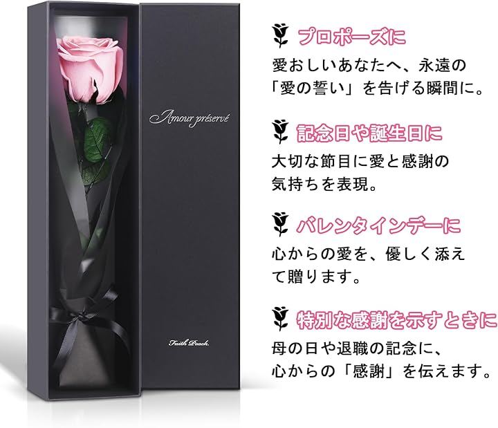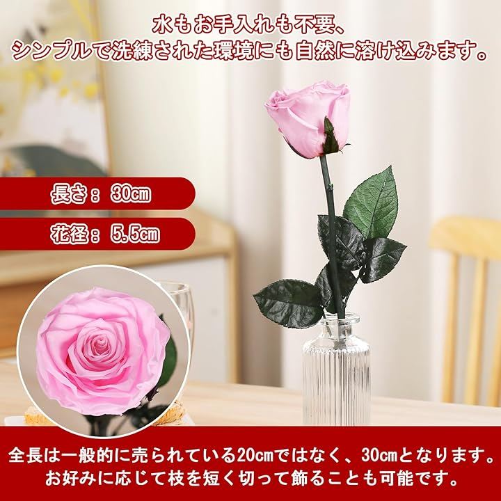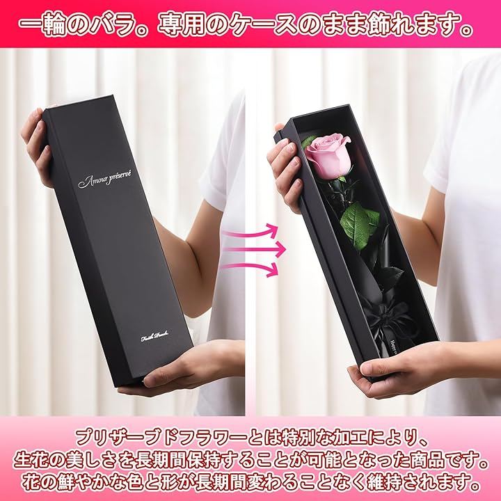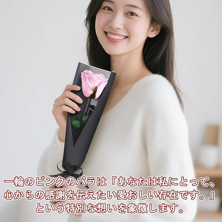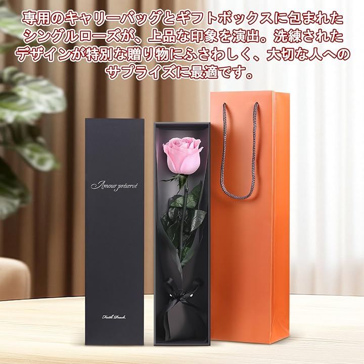 「幅広いシーンで心に残るプレゼント」 シンプルかつ上品な一輪のバラは、どんなインテリアや好みにも馴染みやすいのが特徴です。