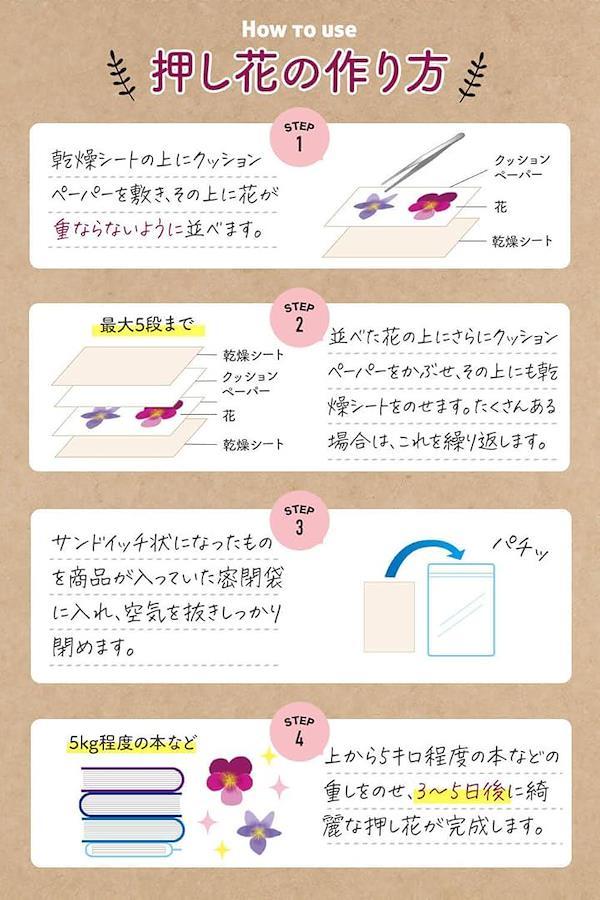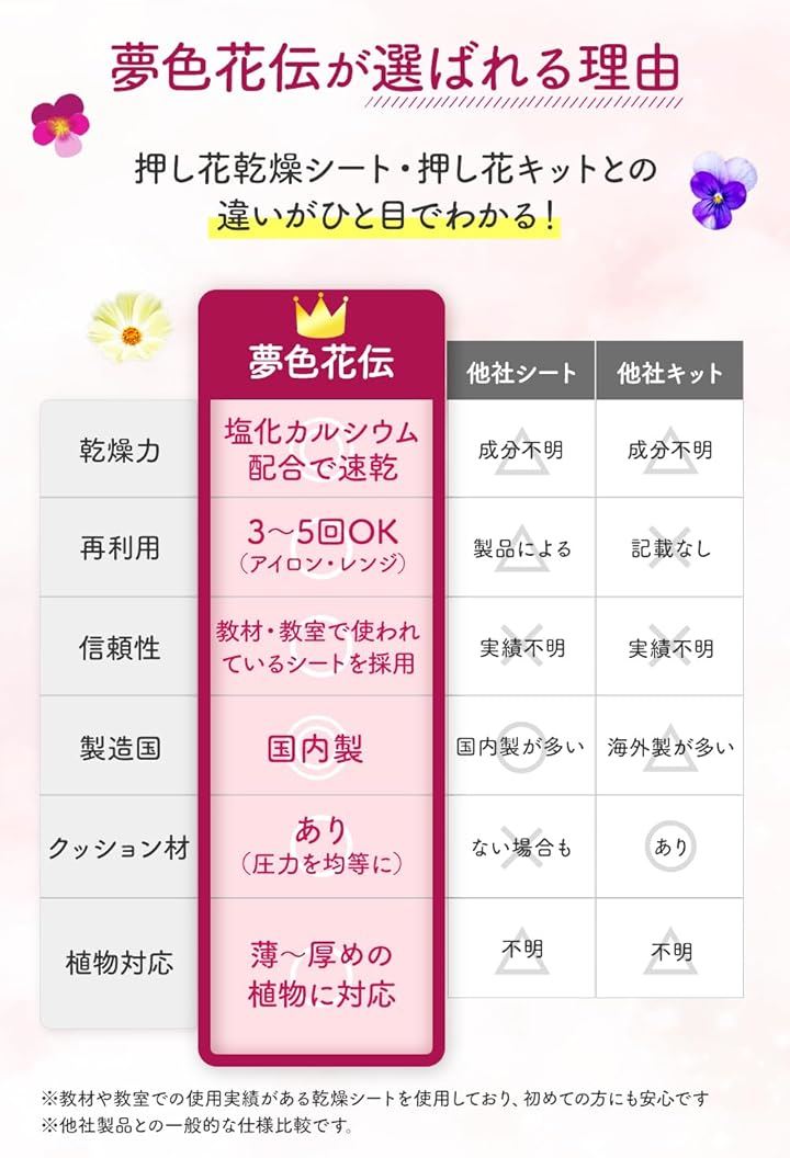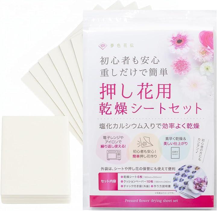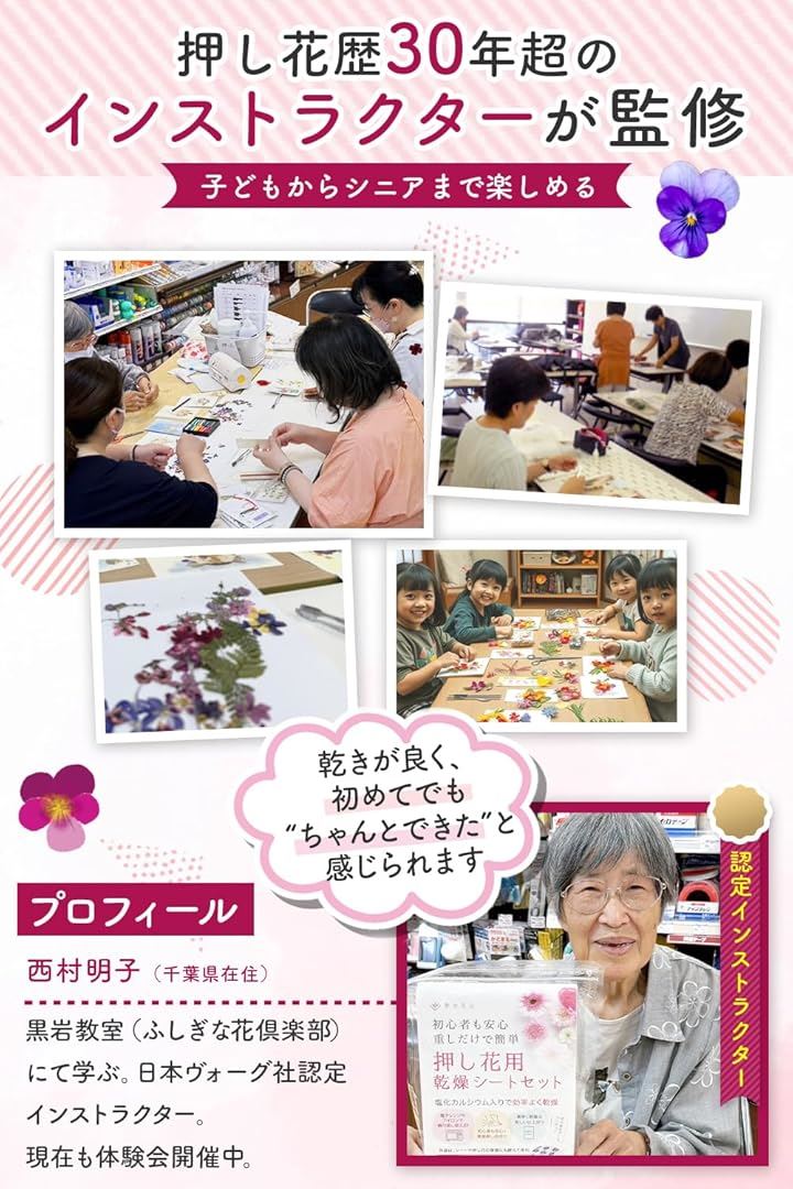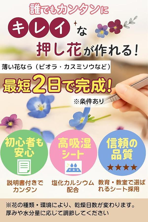 「乾燥成分入りのプロ仕様シートを採用」塩化カルシウム入りで高い吸湿性を持ち、押し花のプロや教材でも使用されている乾燥シートは、短時間で完全に乾燥させることで腐敗による変色を防ぎ、色鮮やかな押し花を作ることができます