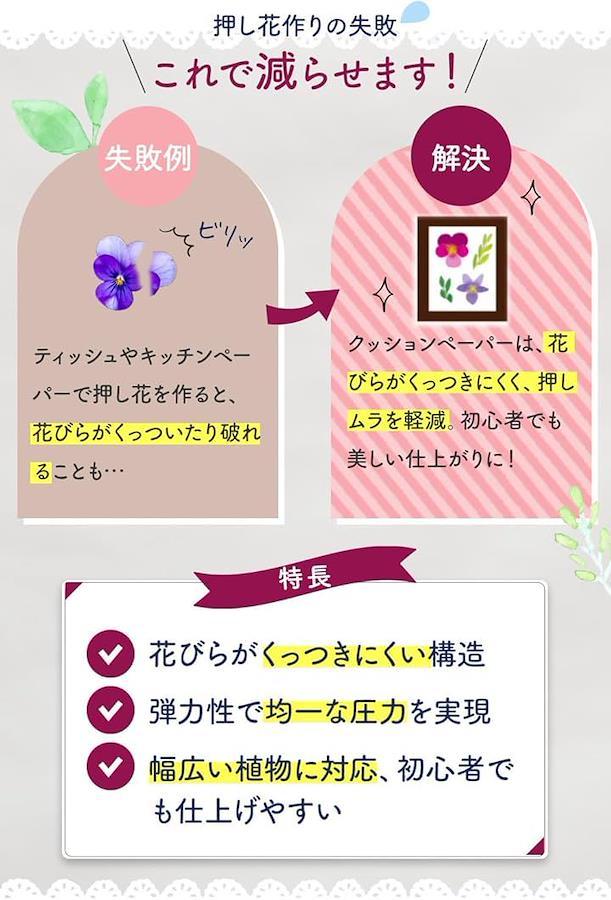 「押し花作りの失敗をグッと軽減」弾力性のあるパルプ素材を使用したクッションペーパーは、しわが寄りにくく凹凸のある植物も均一に押せるうえ、花びらがくっつきにくく剥がしやすい設計です
