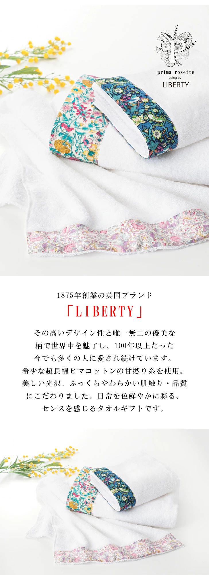 1875年創業の英国ブランド「LIBERTY」。その高いデザイン性と唯一無二の優美な柄で世界中を魅了し、100年以上たった今でも多くの人に愛され続けています。希少な超長綿ピマコットンの甘撚り糸を使用。美しい光沢、ふっくらやわらかい肌触り・品質にこだわりました。日常を色鮮やかに彩る、センスを感じるタオルギフトです。