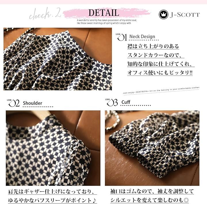 襟は立ち上がりのあるスタンドカラーなので、知的な印象に仕上げてくれ、オフィス使いにもピッタリ。