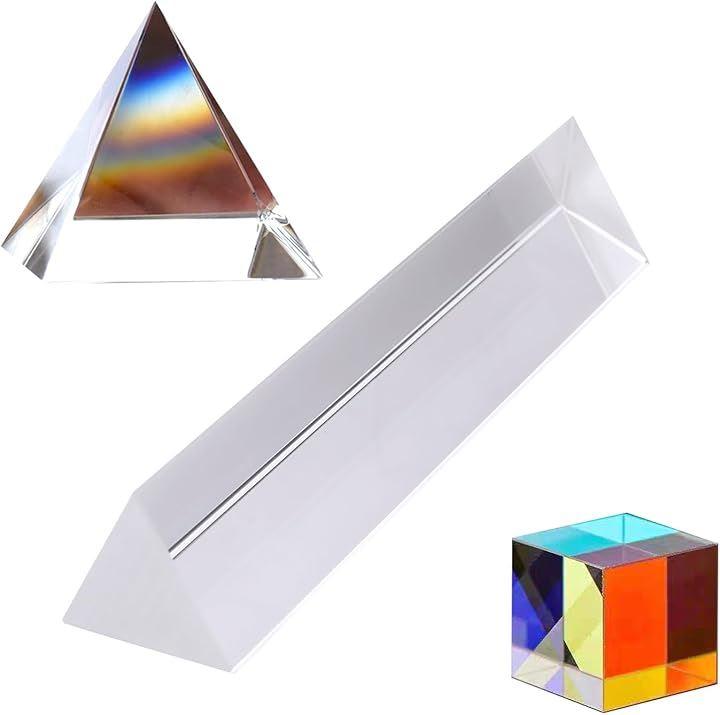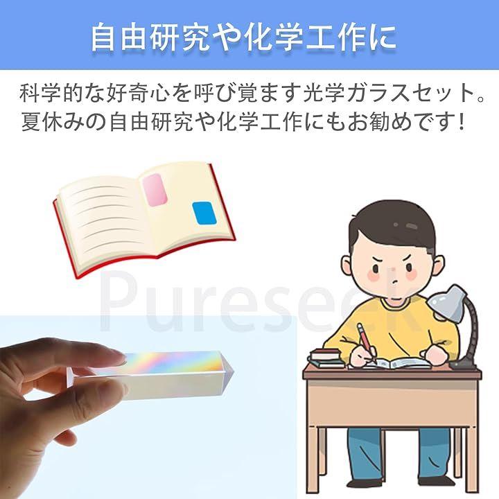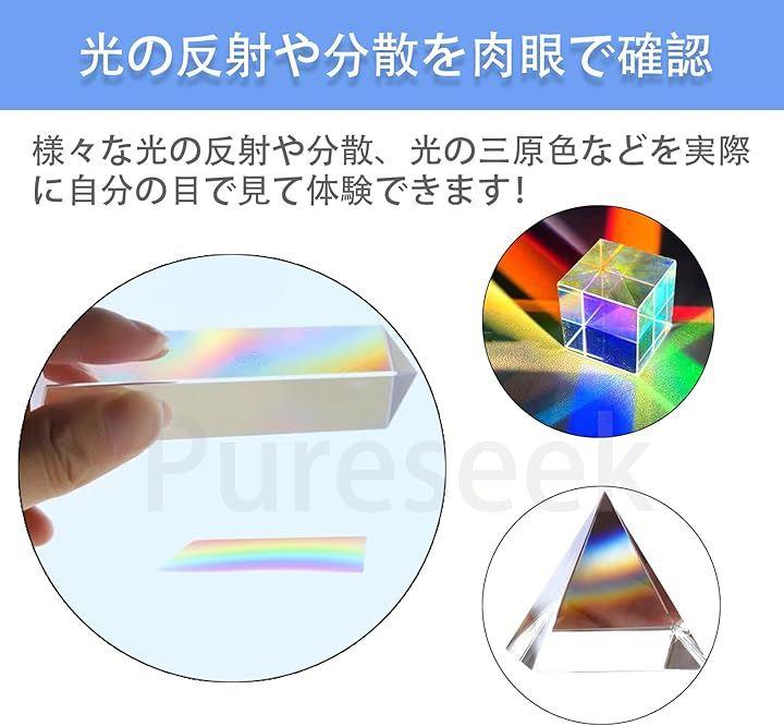 このプリズムセットには一般的な角柱と、立方体、四角錘の3種類の形の光学ガラスが揃っているので、それぞれ光にかざすと屈折率が異なるため様々な光の反射や分散が見られ、光の三原色なども実際に見て体験できます。