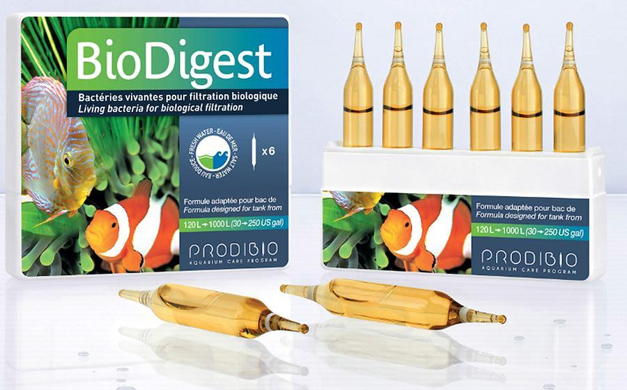 バイオダイジェストは自然の硝化バクテリアや反硝化バクテリア、通性細菌によって構成されています。水槽内の窒素サイクルを創り上げ、有機物を分解し、効率良く水質を改善します。1アンプルに約500億匹のバクテリアが休眠状態でパックされています。