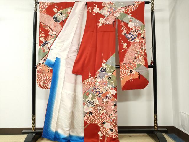 Heiwa-ya Kimono ■ Gorgeous Furisode Kimono with Koma Embroidery, Flowing Water and Plum Blossom Design, Gold Accents, Pure Silk, Excellent Quality, CAAV2069ev