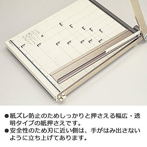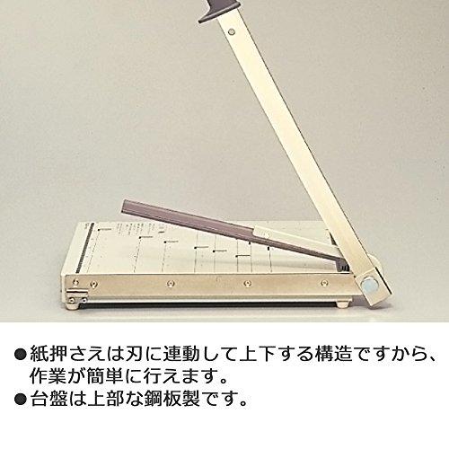 【商品の特長】・一度にPPC用紙約10枚を裁断可能・紙ズレ防止のためしっかりと押さえる幅広で透明タイプの紙押さえ・紙押さえは刃に連動して上下する構造のため作業が簡単にできる・台盤は丈夫な鋼板製・安全のため、刃に近い側は手がはみ出さないように立ち上げてあります・マグネットで固定できる移動ガイド(紙あて)付き・着脱できる屑受け付きのため、裁断後の紙屑の後片付けが容易※ 台盤/定規の寸法表示は目安になり、用紙サイズ等によっても若干の寸法誤差が生じることがありますので試し切りをしてからお使いください※ 品質改善のため予告なく仕様等の変更を行う場合がありますので予めご了承ください