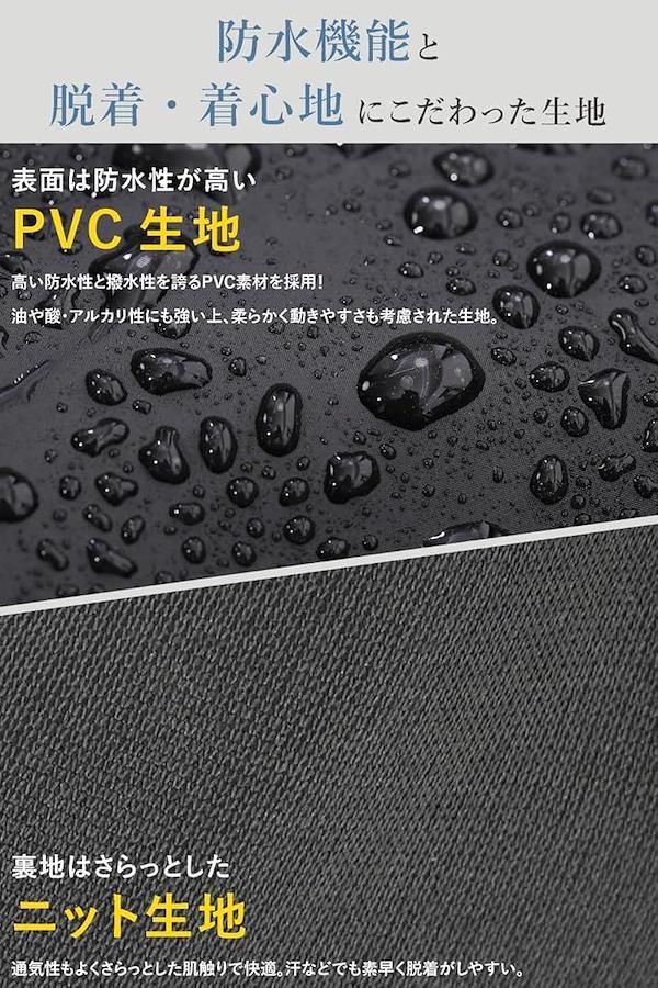 「防水性と着心地にこだわった生地」 表地はPVC・裏地はニット生地を使用しており防水性とともに中の湿気を排出可能な機能性素材。