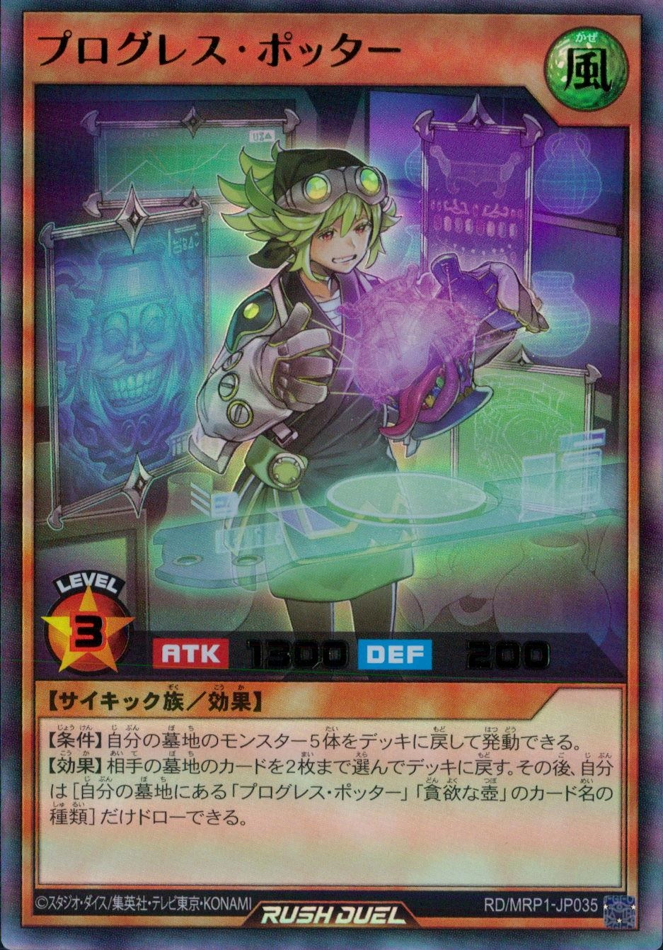 ■発売年月日2022/06/04搭載パック[MRP1]メガロードパック収録コンセプトパックレアリティウルトラレア種類効果モンスター属性風種族サイキック族星3攻撃力1300守備力200シリーズコンセプトパック効果テキスト【条件】自分の墓地のモンスター5体をデッキに戻して発動できる。【効果】相手の墓地のカードを2枚まで選んでデッキに戻す。その後、自分は[自分の墓地にある「プログレス・ポッター」「貪欲な壺」のカード名の種類]だけドローできる。■商品ランクについてA:中古品で比較きれいな商品です。コレクター向きではございません。B:カジュアルプレイ向きです。削れやめくれ、傷などがある場合がほとんどです。