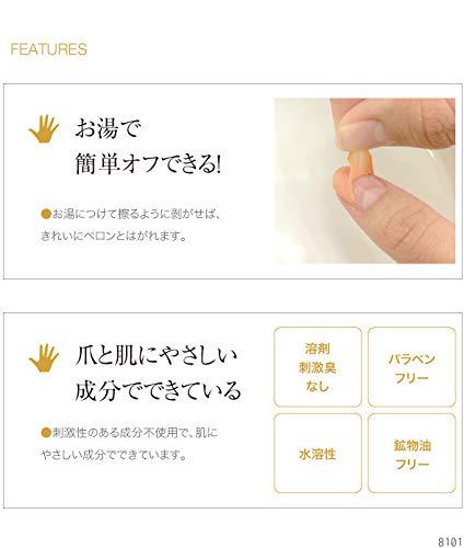 爪の成分に近しい美容成分を配合し、ダメージ爪を潤い補修(コーティング効果)。自然な発色で上品にほんのり色づきます。筆ペンタイプで塗りやすくネイルが苦手な人も簡単。速乾なので忙しい人も、いつでもどこでもネイルケアできます。お湯でペロリと剥がせるので、除光液で爪を傷める心配もありません。ほんのりさくらの香り。