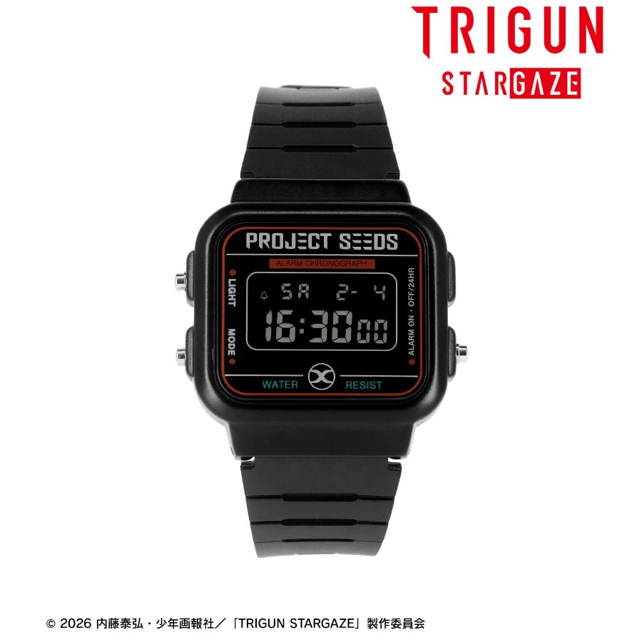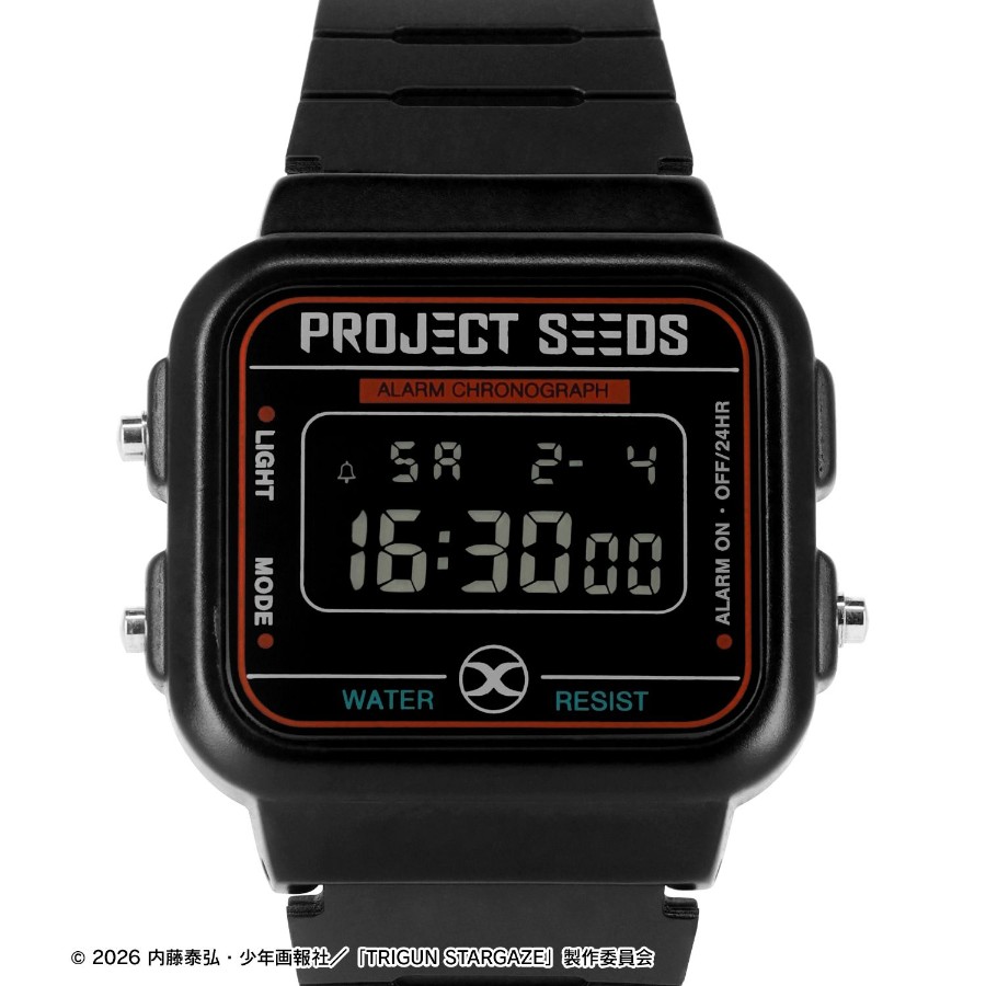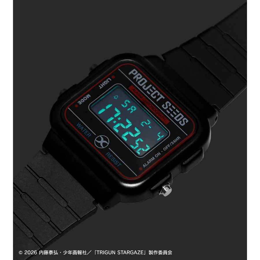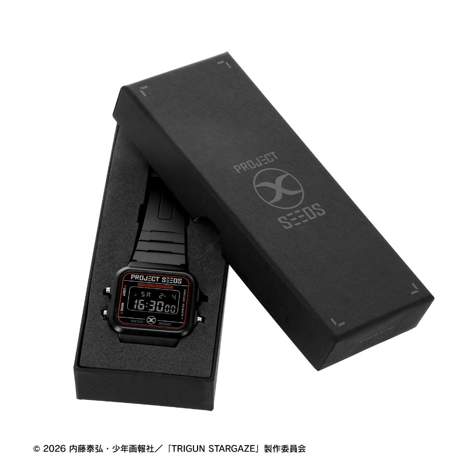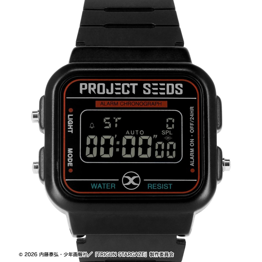 「TRIGUN STARGAZE」製作委員会 プロジェクトSEEDS デジタルウオッチ TVアニメ「TRIGUN STARGAZE」より、デジタルウオッチの登場です。 ブラックを基調としたボディに、ストラップと文字盤の「プロジェクトSEEDS」ロゴが映えるデザインで、ユニセックスかつカジュアルに使いこなせるコンセプトに仕上げました。 裏蓋には『TRIGUN STARGAZE』のロゴを刻印しています。 専用BOXには「プロジェクトSEEDS」のロゴを施し、そのまま飾っておけるよう、高級感のある仕様です。 ストップウオッチ、3気圧防水、アラームなどの機能を備えており、日常使いからイベントなどの特別な日まで、様々なシーンで活躍のできるアイテムです。