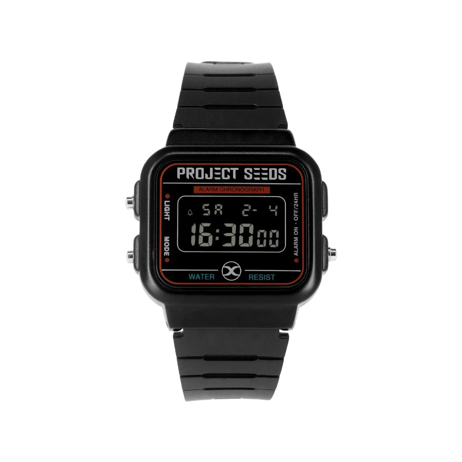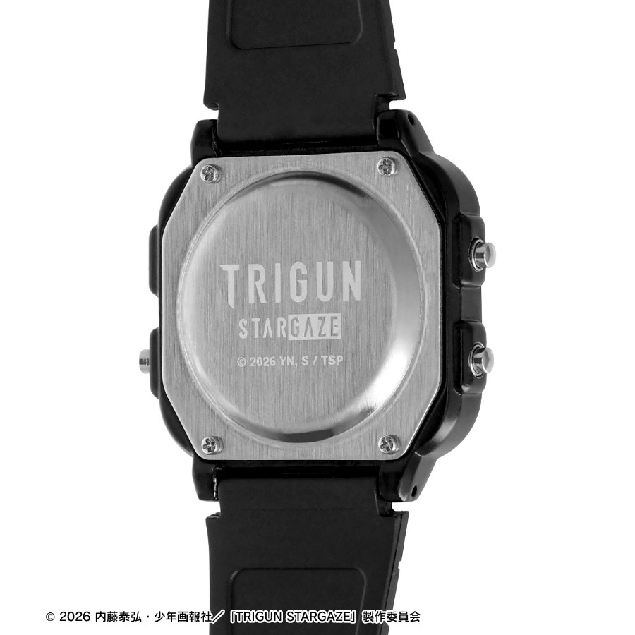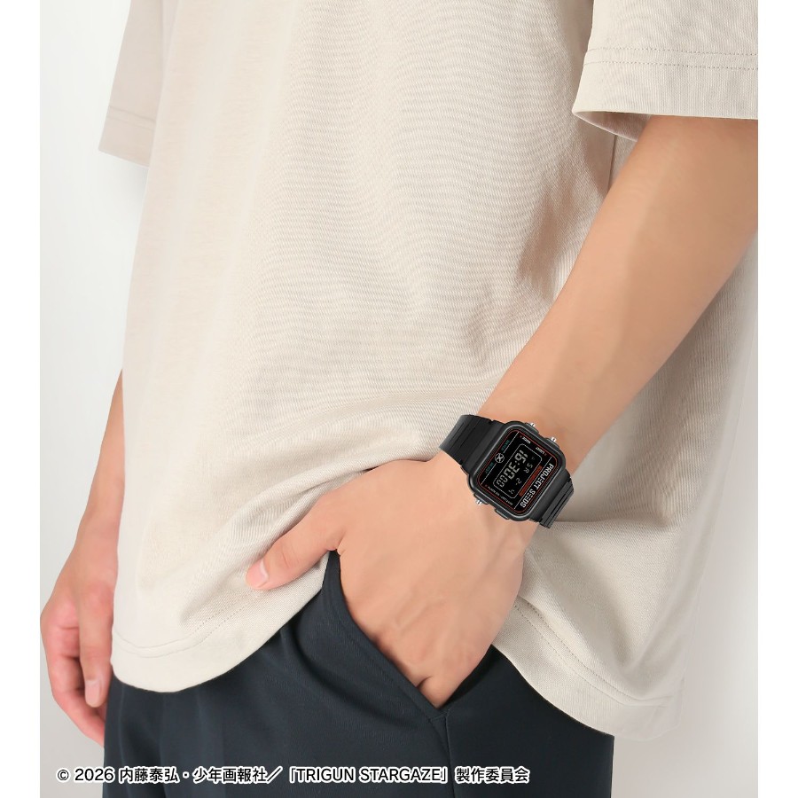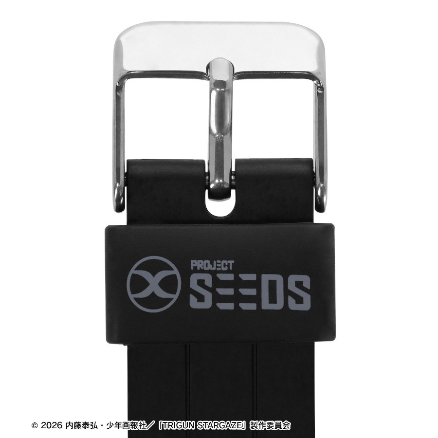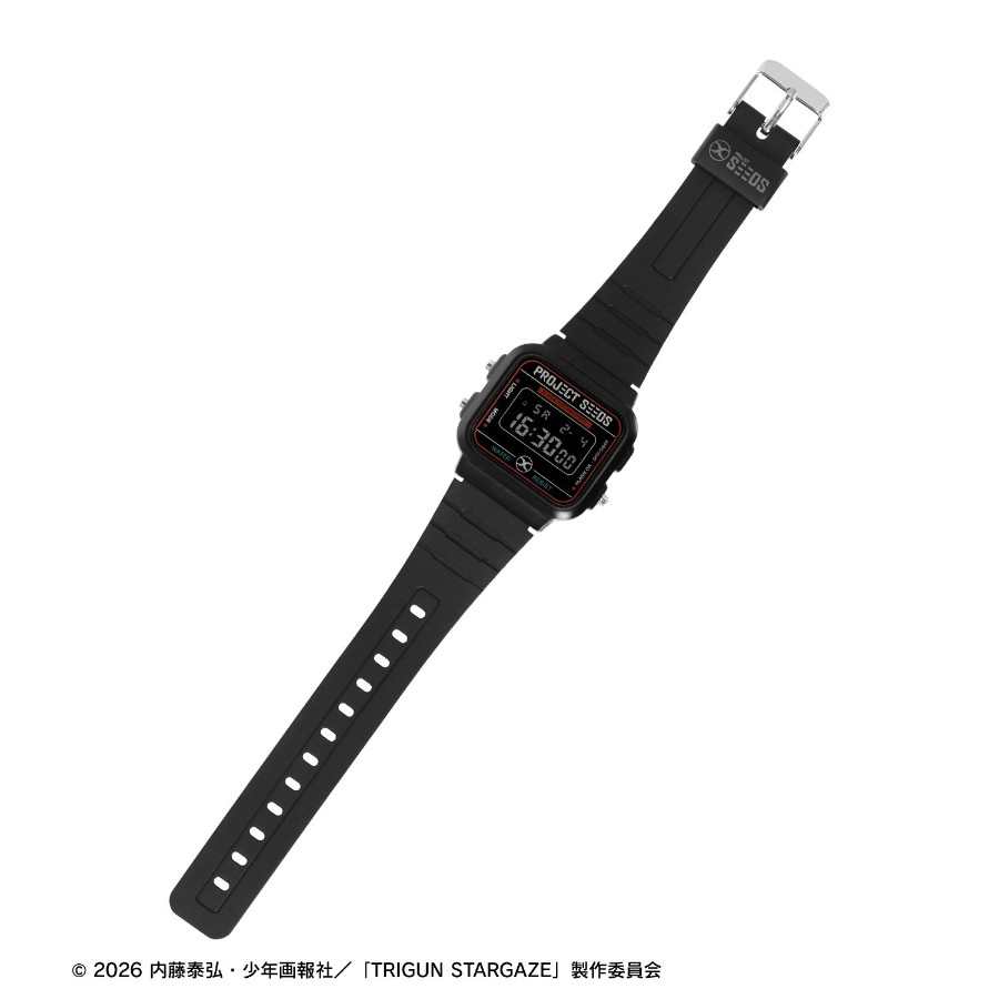 「TRIGUN STARGAZE」製作委員会 プロジェクトSEEDS デジタルウオッチ TVアニメ「TRIGUN STARGAZE」より、デジタルウオッチの登場です。 ブラックを基調としたボディに、ストラップと文字盤の「プロジェクトSEEDS」ロゴが映えるデザインで、ユニセックスかつカジュアルに使いこなせるコンセプトに仕上げました。 裏蓋には『TRIGUN STARGAZE』のロゴを刻印しています。 専用BOXには「プロジェクトSEEDS」のロゴを施し、そのまま飾っておけるよう、高級感のある仕様です。 ストップウオッチ、3気圧防水、アラームなどの機能を備えており、日常使いからイベントなどの特別な日まで、様々なシーンで活躍のできるアイテムです。