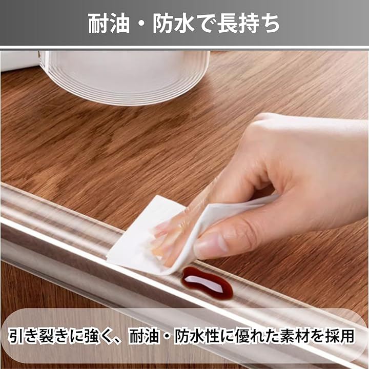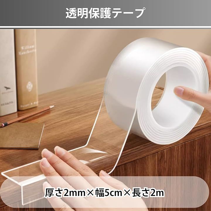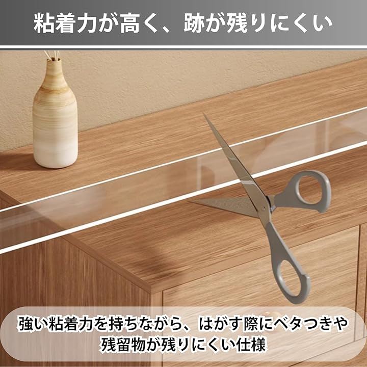 「粘着力が高く、跡が残りにくい」透明タイプの保護テープは強い粘着力を持ちながら、はがす際にベタつきや残留物が残りにくい仕様。