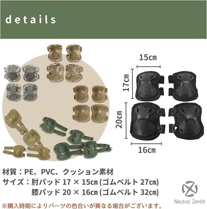 「商品詳細」材質:EVA サイズ:「肘パッド」全長 約17cm、横幅 約15cm、ベルト 約27cm 「膝パッド」全長 約20cm、横幅 約16cm、ベルト 約32cm カラー:ブラック / サンド / アーミーグリーン / コヨーテ / マルチカム / デジタルカモ