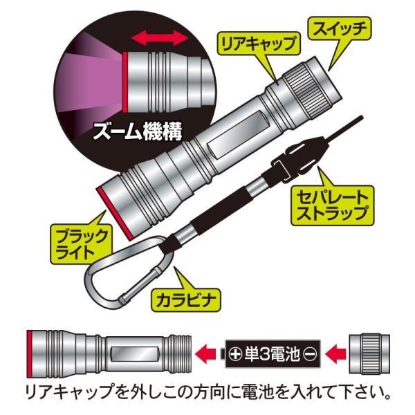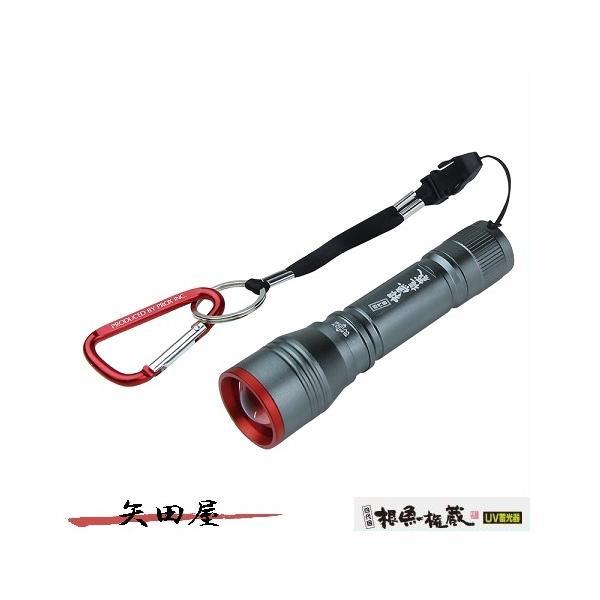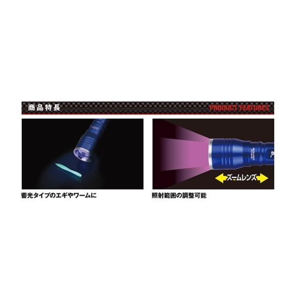ハイパワーLED搭載コンパクト蓄光器 LEDがパワーアップした根魚権蔵蓄光器の四代目。三代目と比べパワーのあるブラックUV-LEDチップを搭載。 照射範囲を変えられるズーム機構。持ち運びに便利なカラビナ付ストラップ付属。メバル、アジング、ワインド等のルアーの照射に最適な四代目根魚権蔵蓄光器。【光源】:ブラックUV-LED1灯【照明時間】:約3時間【使用電池】:単3×1(別売)